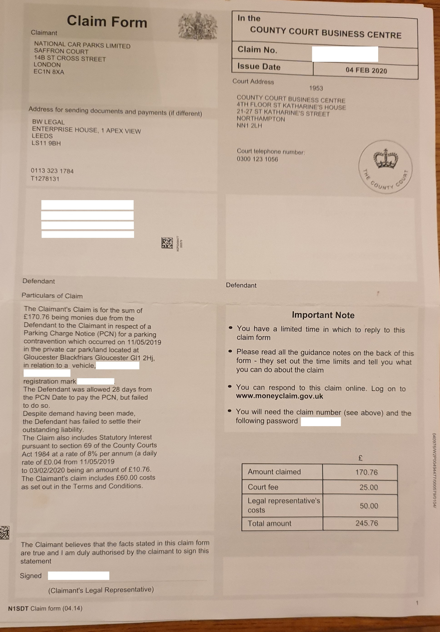 On the 11/05/19 I entered an NCP car park at the address above in Gloucester, parked my car and went to the ticket booth to pay for my ticket. I tried several times to purchase a ticket however the machine didn't accept my card. After that, I left. This took a total time of 14 minutes. The letters were sent to my parents house in Wales however I was living in England for six months in a work facility, then lived with my partners family for a few months, and only this year moved into my first home. I had calls from a company called 'BWLegal' and simply hung up straight away assuming it was scam, never thought about it. When clearing out my old room I found a stack of letters my parents kept for me and found out about this. Due to the threatening nature of the letters by this point, I decided it was too far gone to do anything but prepare a defence. And voila, I got this delivered to my parents house this week.