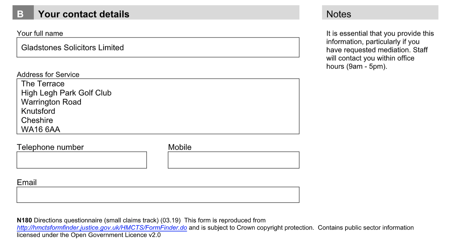 The most recent General Form of Judgement Order I received says that I must send the documents to the court and to the other party, but I don't have contact details for Gladstone on any of the paperwork other than a Postal address. They left their email and phone number blank on the Directions Questionaire. I do however have the personal email address of the person at Gladstones who emailed the DQ to me. Would it be safe for me to email the court the documents as well as the individual who sent me the DQ?0