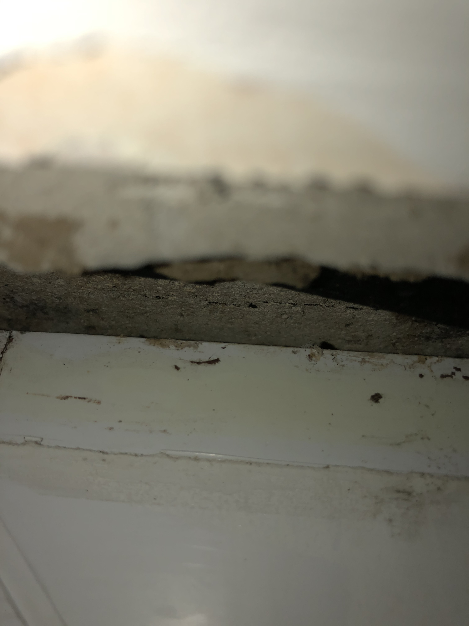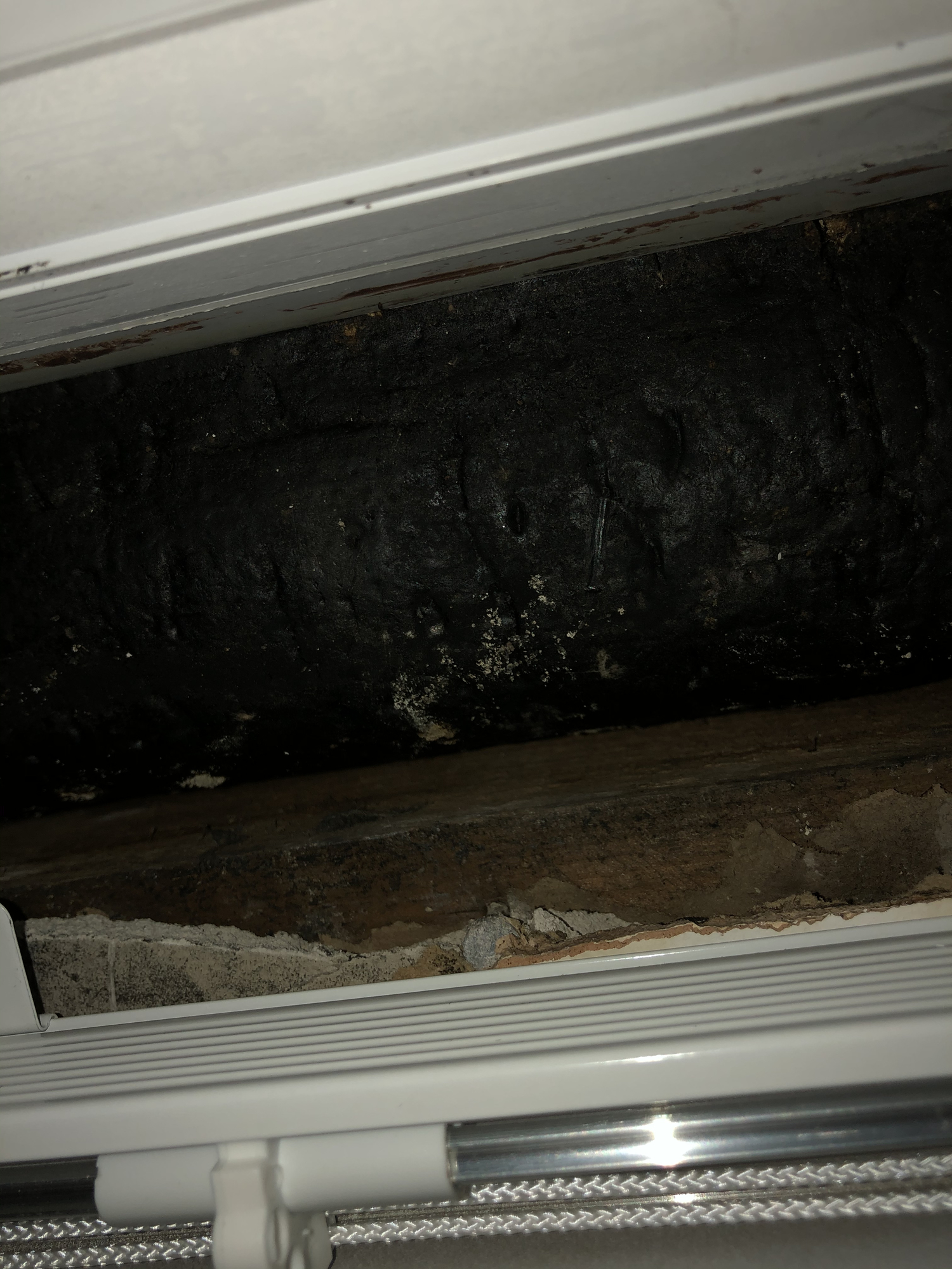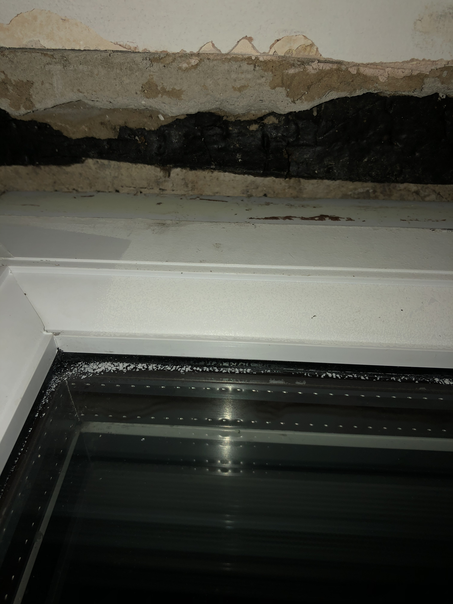 Ive included a couple of shots from the inside below. Difficult to get a clear shot, but you can see the brickwork above the frame inside, and also the timber lintel which is supporting the inner blockwork. You can also see that the damp proofing is woefully inadequate and in rather bad shape... a perfect storm...The two houses next door to me are the same construction. You can see the fresh brickwork where they have had to have lintels installed in the past, presumably when fitting UPVC. Haven’t had a chance to speak with one of the neighbours yet though. Speaking with a couple of window fitters that have been to quote for the job, apparently it was standard with this particular firm who have built the house...
