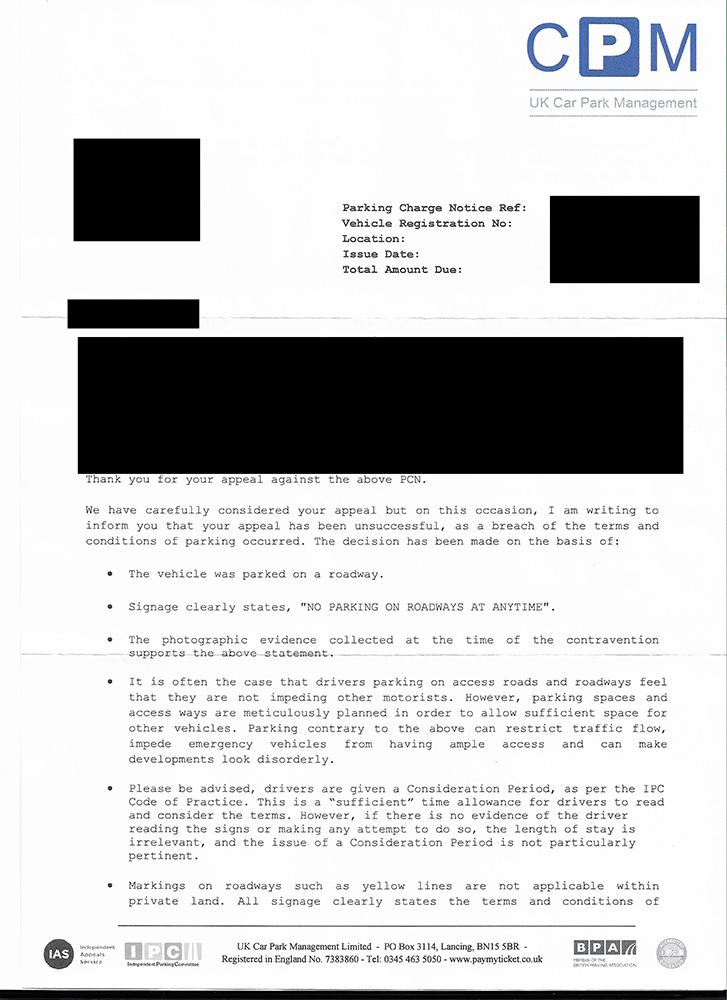 Parking Charge Notice - UK Car Park Management (UK CPM) - double yellows private road.