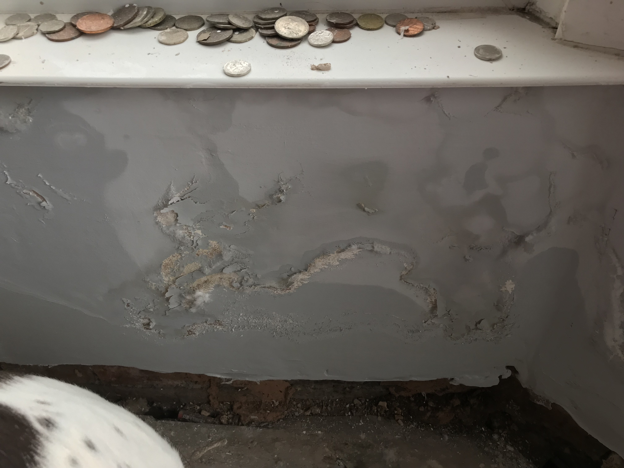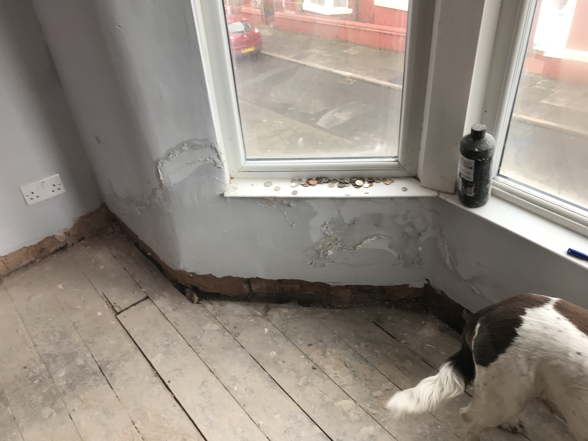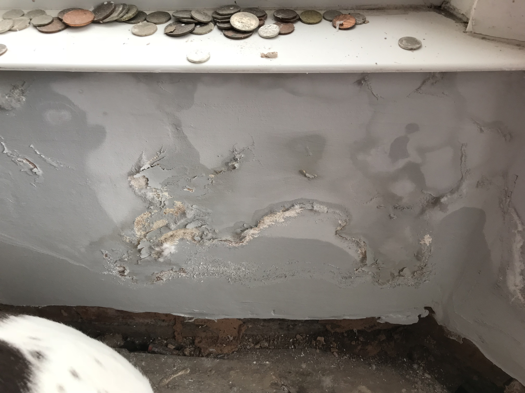 The cause of the damp was quite obvious, and necessitated the chipping off of the external render and internal plaster to a height of 1.5m. The area was then left to dry out, before injecting with the treatment at regular spacing intervals. It was then covered in new plaster, which again had to dry out before I could repaint the walls. All in all was a load of dust and hassle for about 4 weeks (I have a very low tolerance for such disruption and additional time wasted in cleaning, but am very glad it's done with). For that reason, I left it until the summer for the work to be done.