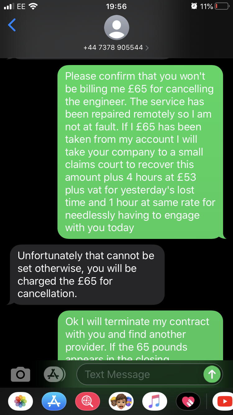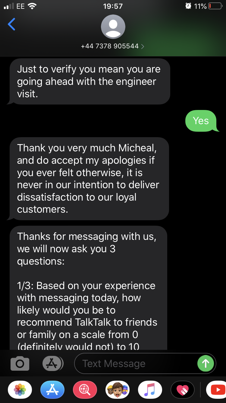 On Thursday i worked from the office as i had no internet at home. Around 1-2pm my wife texted me to say the internet service had resumed. I returned home around 5pm and checked the internet service for myself and it was apparently fine. Clearly it had been reset/repaired remotely and there would be no need for an engineer to visit. I decided to inform talktalk via a text message that a visit from the engineer was no longer necessary. Please see following text dialogue.