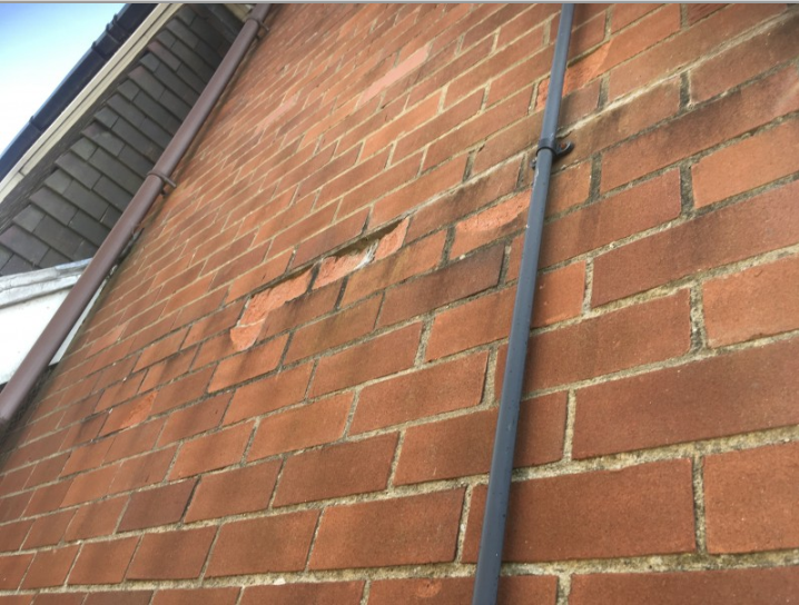 The bricks do seem prone to cracking, there are a number with fine cracks that don't extend to the mortar joints and quite a few spalled bricks particularly on the left side elevation of the extension. It's unclear whether the obviously different breaks have already been replaced due to spalling, certainly the mortar joints don't appear different to the surrounding joints.