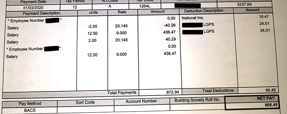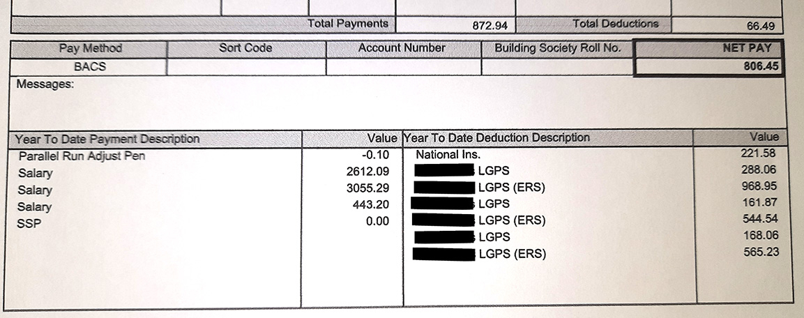 The thing is, the contributions her payslip says she's made to the LGPS don't add up to her ACTUAL contributions. She only paid in £576.12. Does anyone know why those figures might differ?
