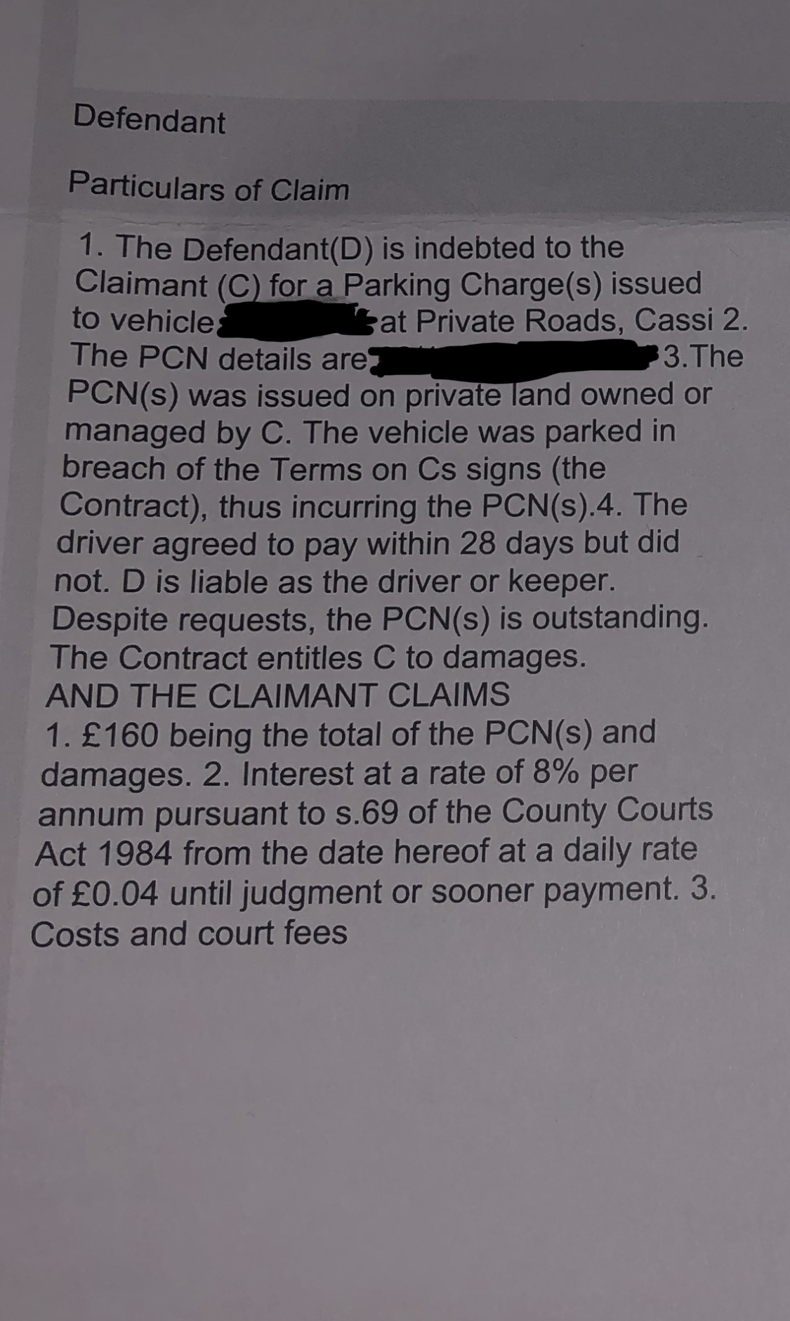 you did not answer all my questions and neither did the scan or picture eitherI asked what the original pcn was , because its not £160 , probably £100then it appears they added an unlawful £60 for damages , so a global sum of £160plus interest on that sumplus court fees etcI dont see £190.85 listed there , nor the total claimed including the court fees etcso the point is that somehow the £100 pcn charge morphed into almost double , plus the court fee and hearing fee etc making about £265.85here is a breakdown by Umkomaas posted some time ago£100 - original parking charge