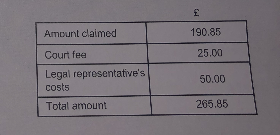 I have already posted a breakdown, is that useful?I dont see £190.85 listed there , nor the total claimed including the court fees etc1 -