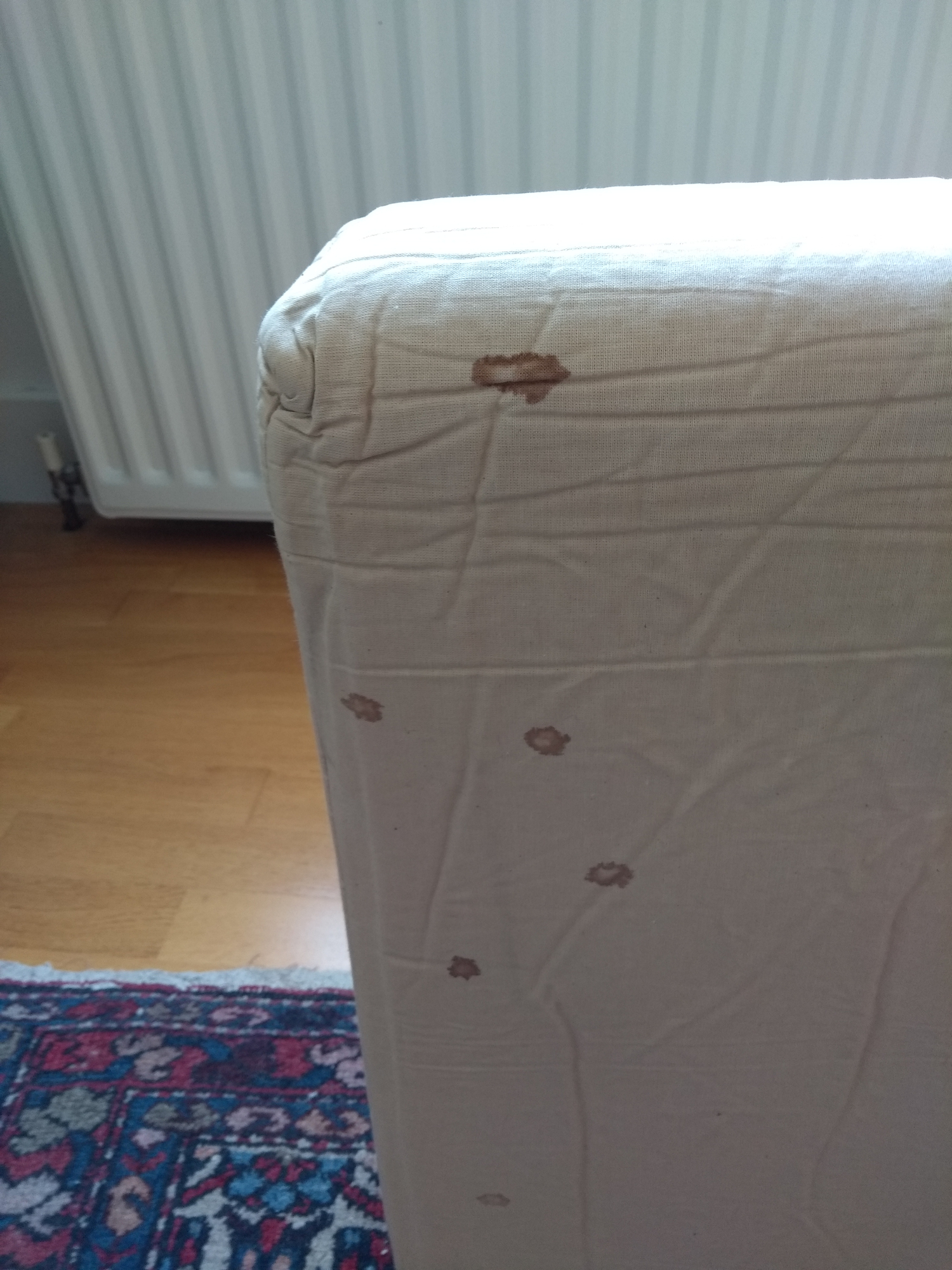 It looks a little like blood to me (although could be hot chocolate/coffee too) although I'm at a loss to understand how a vertical surface can have circular marks rather than drips. Do you have children? Could they have been playing with blow darts at some point in the past?Is it vertical though? Could well be the seat cusion standing up for a photo.Certainly does look like blood to me too though.0 -