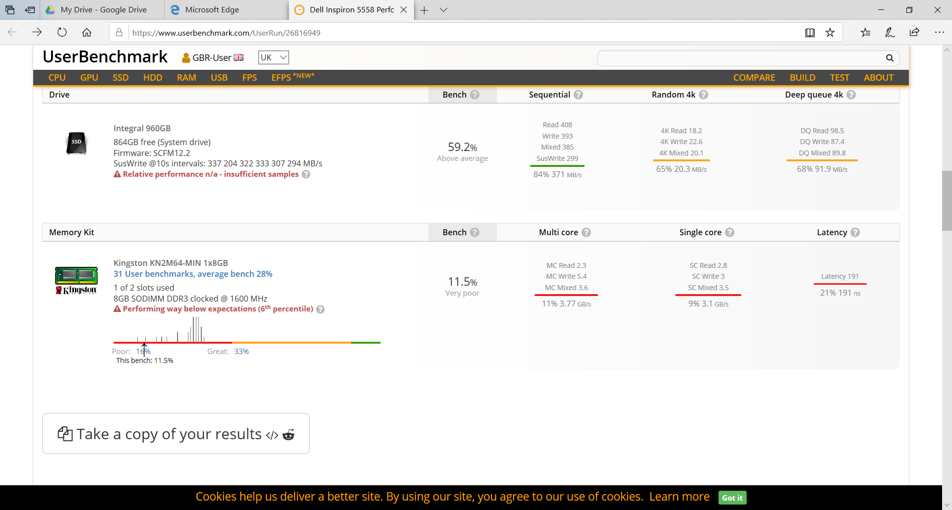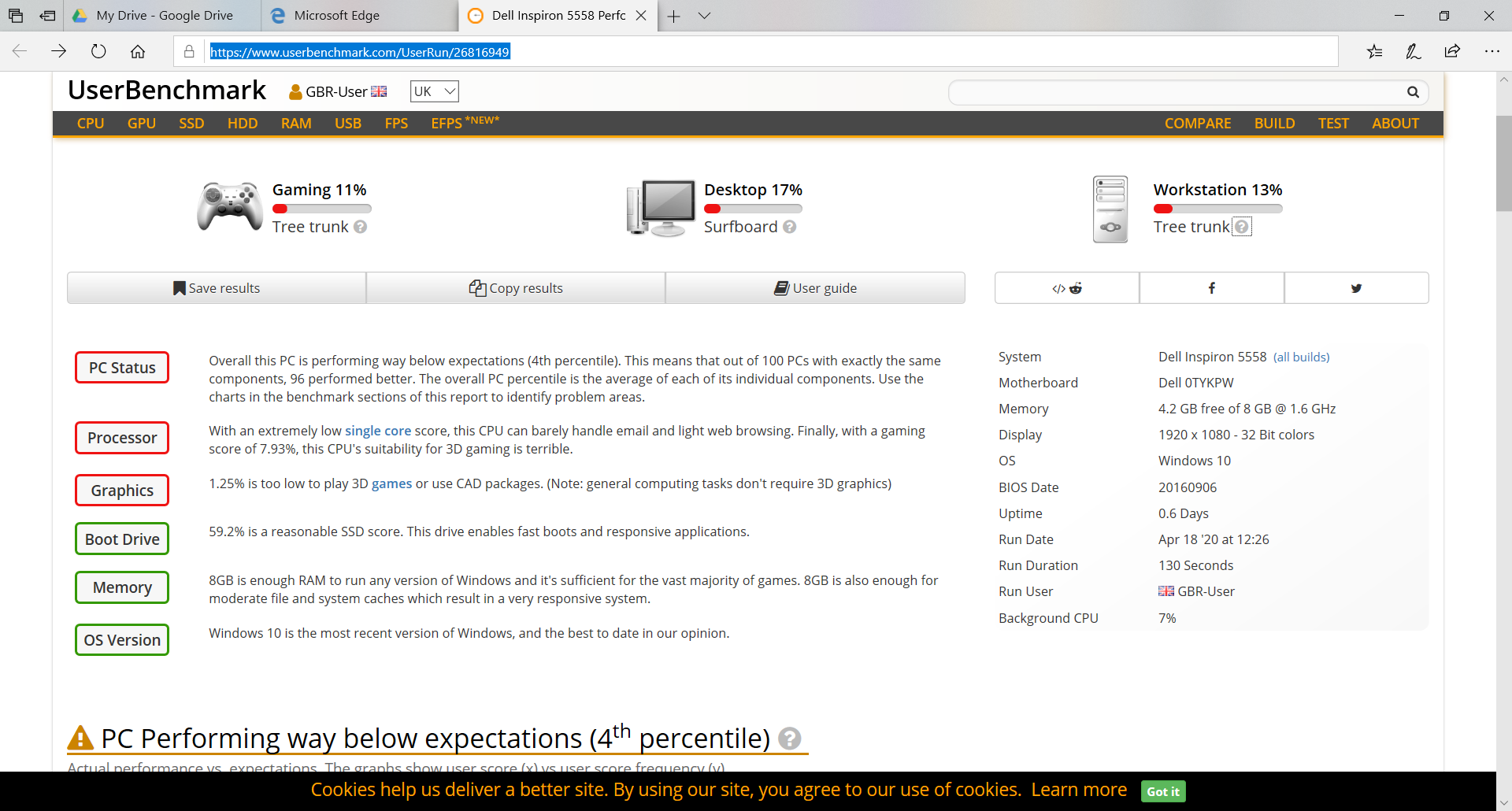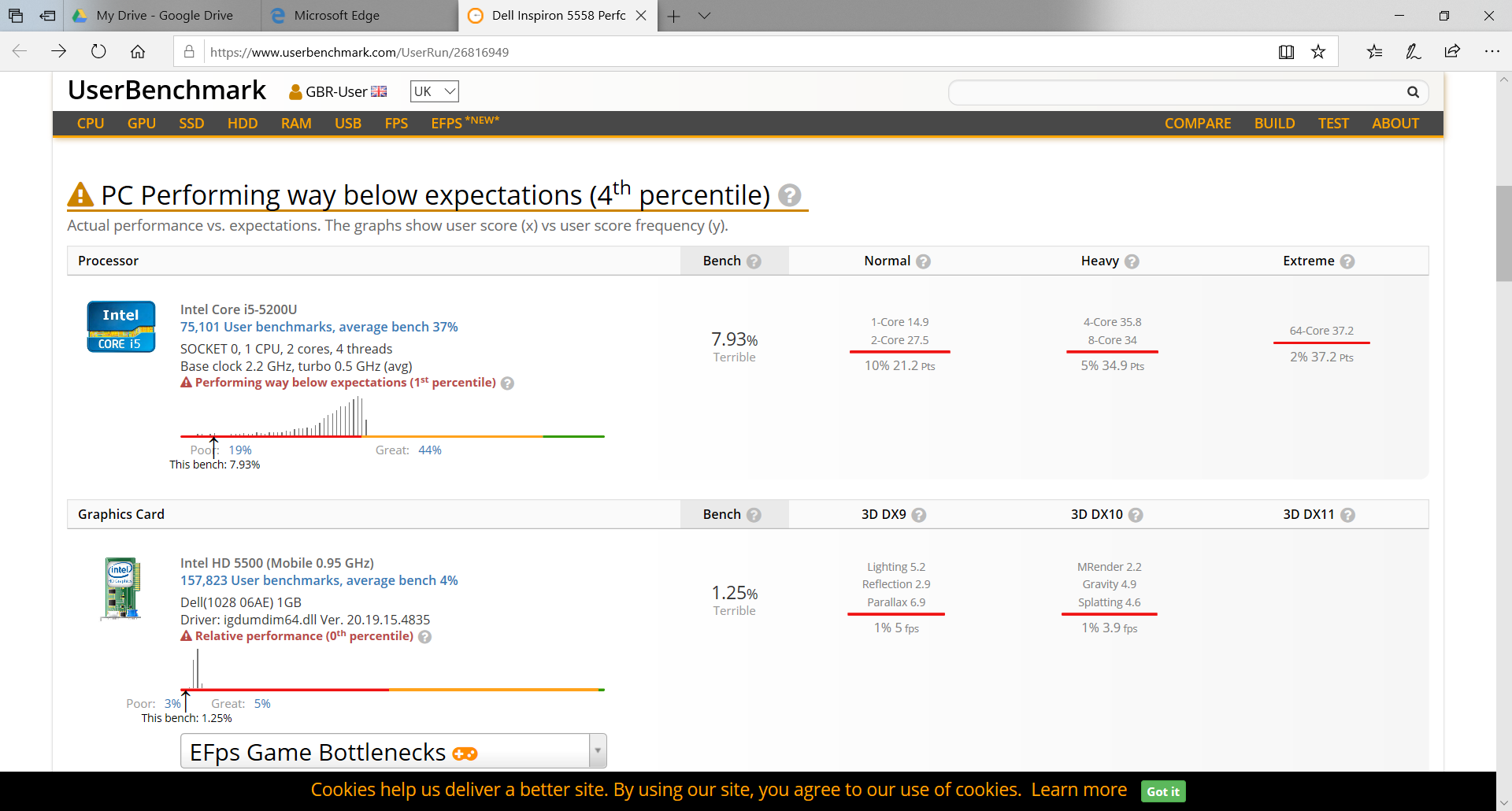 https://www.userbenchmark.com/UserRun/26828077 ... My laptop for comparison. For some reason it couldn't use the GT540m graphics card (even when I forced the program to use it) hence why the score is so low for gaming.