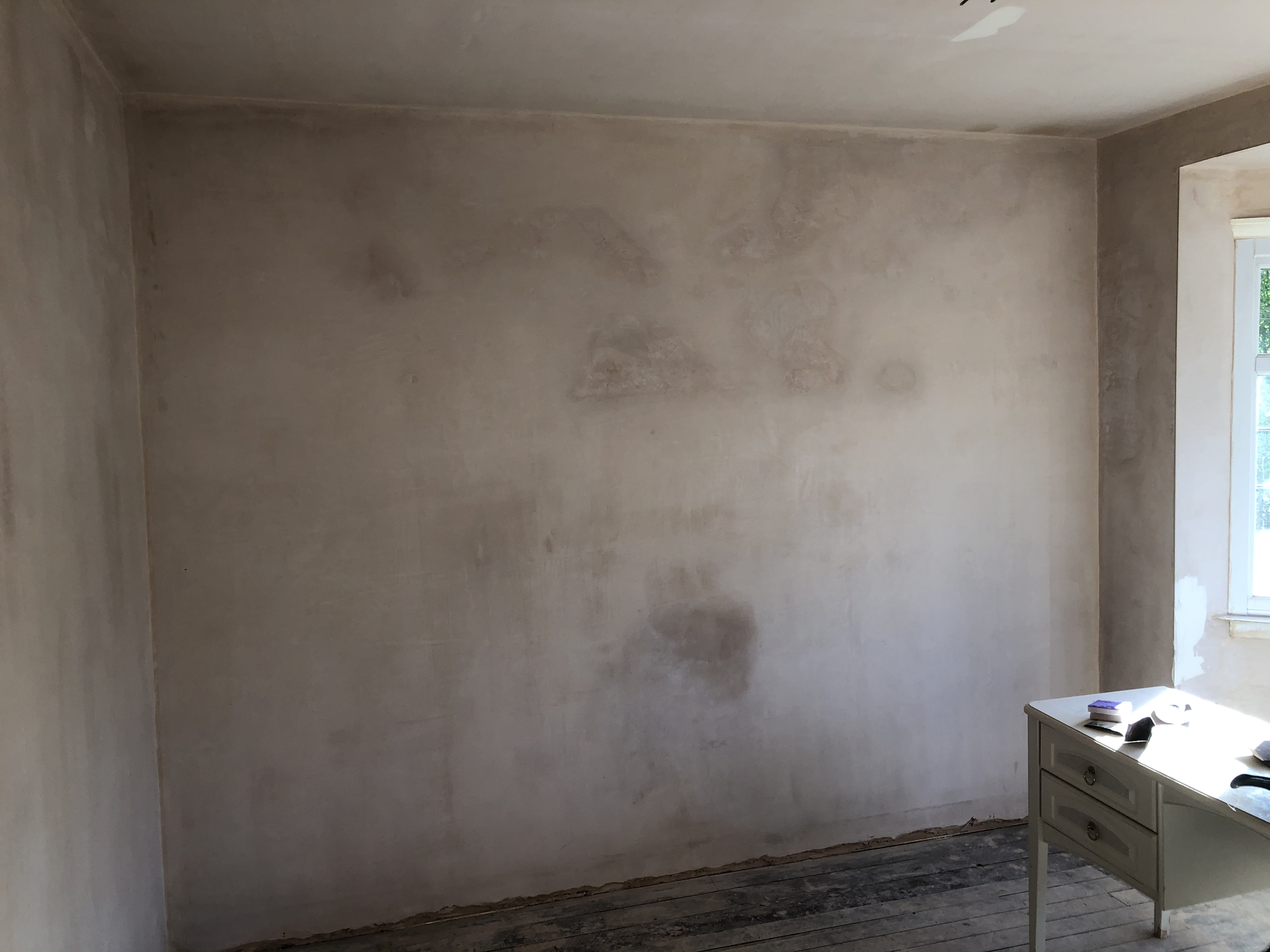 Before plastering, when I had taken off the wallpaper, the offending wall plaster looked quite dark and was coming off by tapping it. The previous owners had a fitted wardrobe against this wall so I couldn’t see it when viewing the house. Not knowing much about plaster, I didn’t think much of it and the plasterer didn’t mention anything either so I didn’t see the old crumbling plaster as a problem.