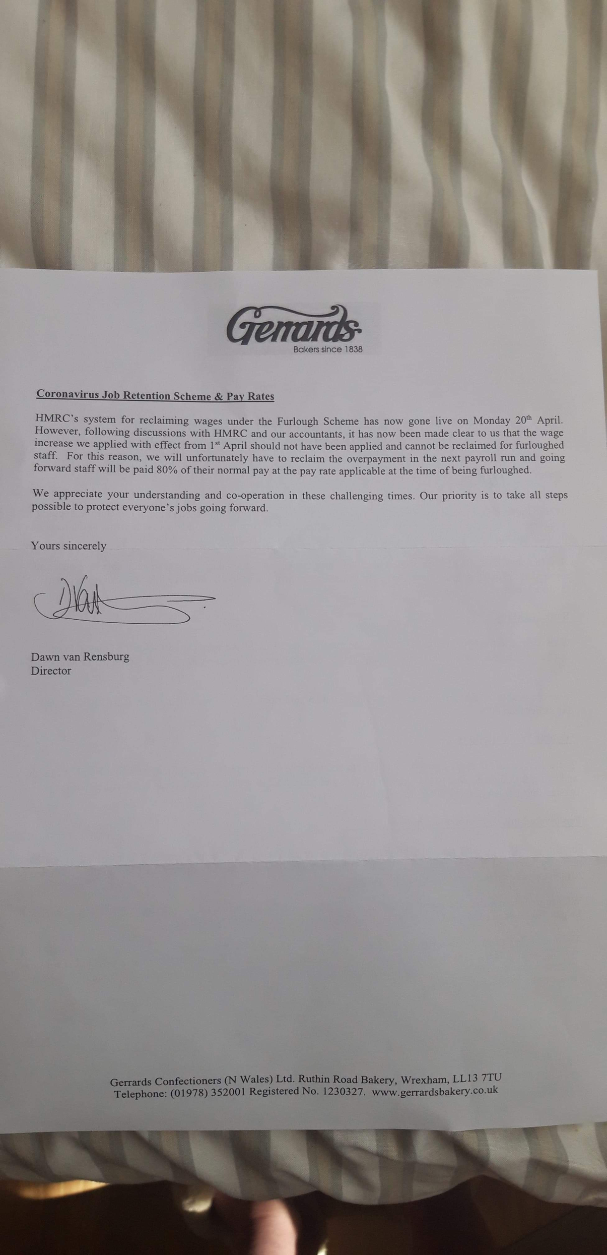 The letter is saying that the staff were overpaid as the business increased their pay as per the 1 April NMW increase. As the CJRS is based on Feb pay the business has effectively overpaid staff and are writing to say that the next month's pay will be less the difference.