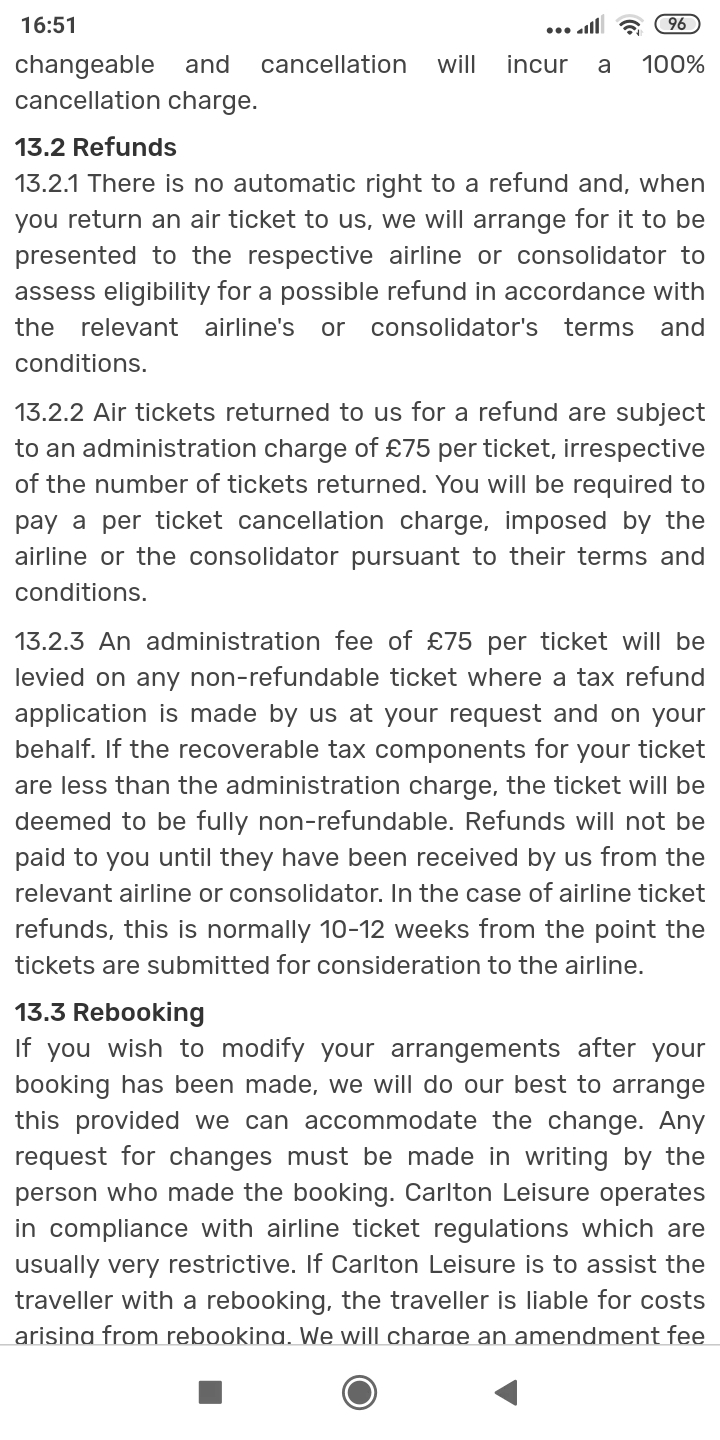 I booked a multi-flight trip through Carlton Leisure in Feb this year - there are 12 flights in total (6 for me and 6 for my partner) - Emirates have emailed confirming the flights have been cancelled and advised to contact whoever the flights were booked through. I done this and never heard back for over 1 month. I emailed Carlton Leisure again and they replied saying that they would refund the amount I paid other than £75 per person for an admin fee. I questioned this and they then replied with their terms and conditions which explained there would be a £75 charge per person per ticket. I have now advised them I want a refund in full and they have offered a refund to reduce the admin fee to £50 per person. I have asked several times for them to clarify if the admin fee is per person or per person per ticket and they have never clarified this, they just ignore the question.