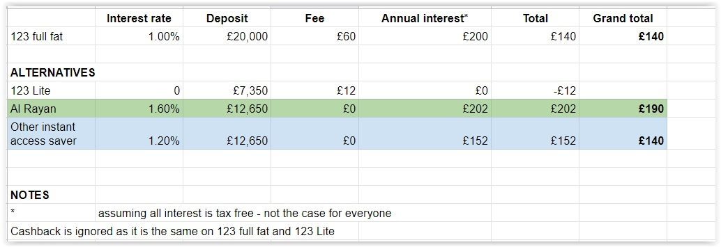 koru said:The current best instant access rate is Marcus at 1.2%. Although that is a bit higher than the new 1% rate on S123, it is only 0.2% better. And if you switch to S123 Lite, you can't switch all your S123 balance to Marcus, because you need a 'float' in your current account to cover outgoings. With S123, you get 1% on the whole amount (up to £20k), including the float, but with S123 Lite you get 0%, so the net effect on interest depends on how big a balance you have in S123 Lite. Compared to S123, you get an extra 0.2% on what you move to Marcus, but you lose 1% on the float you leave in your S123 Lite.0