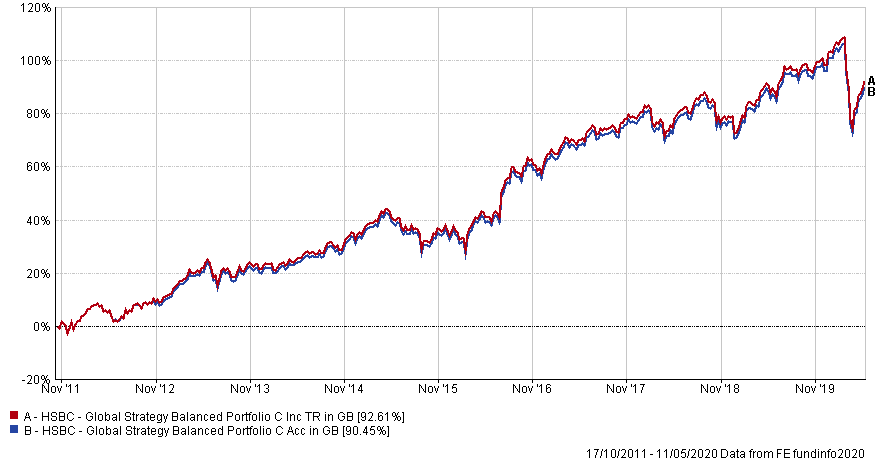 The Vanguard S&P tracker acc history is short so I picked another popular multi-asset fund with Acc units and Inc units reinvested.