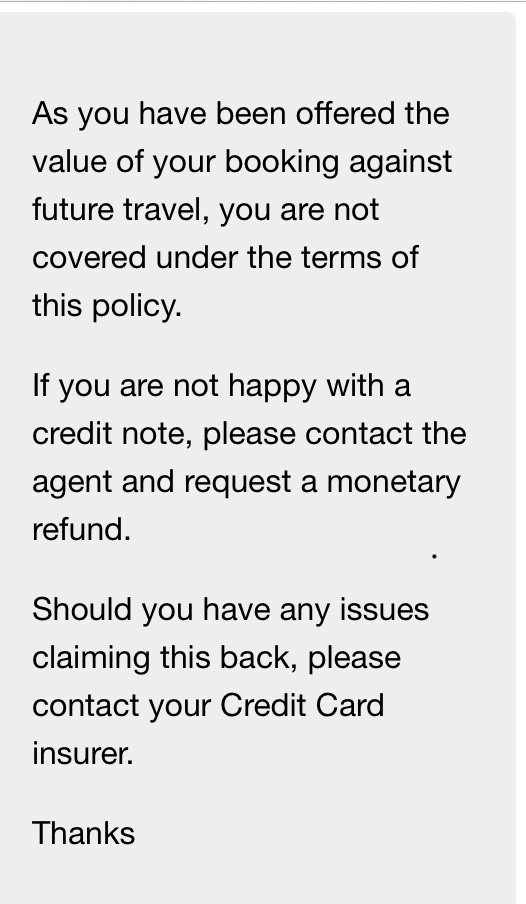 Insurance claims handler rang today to confirm claim refused solely on the credit note offered (the fact WE cancelled on FCO advice was irrelevant)0 -