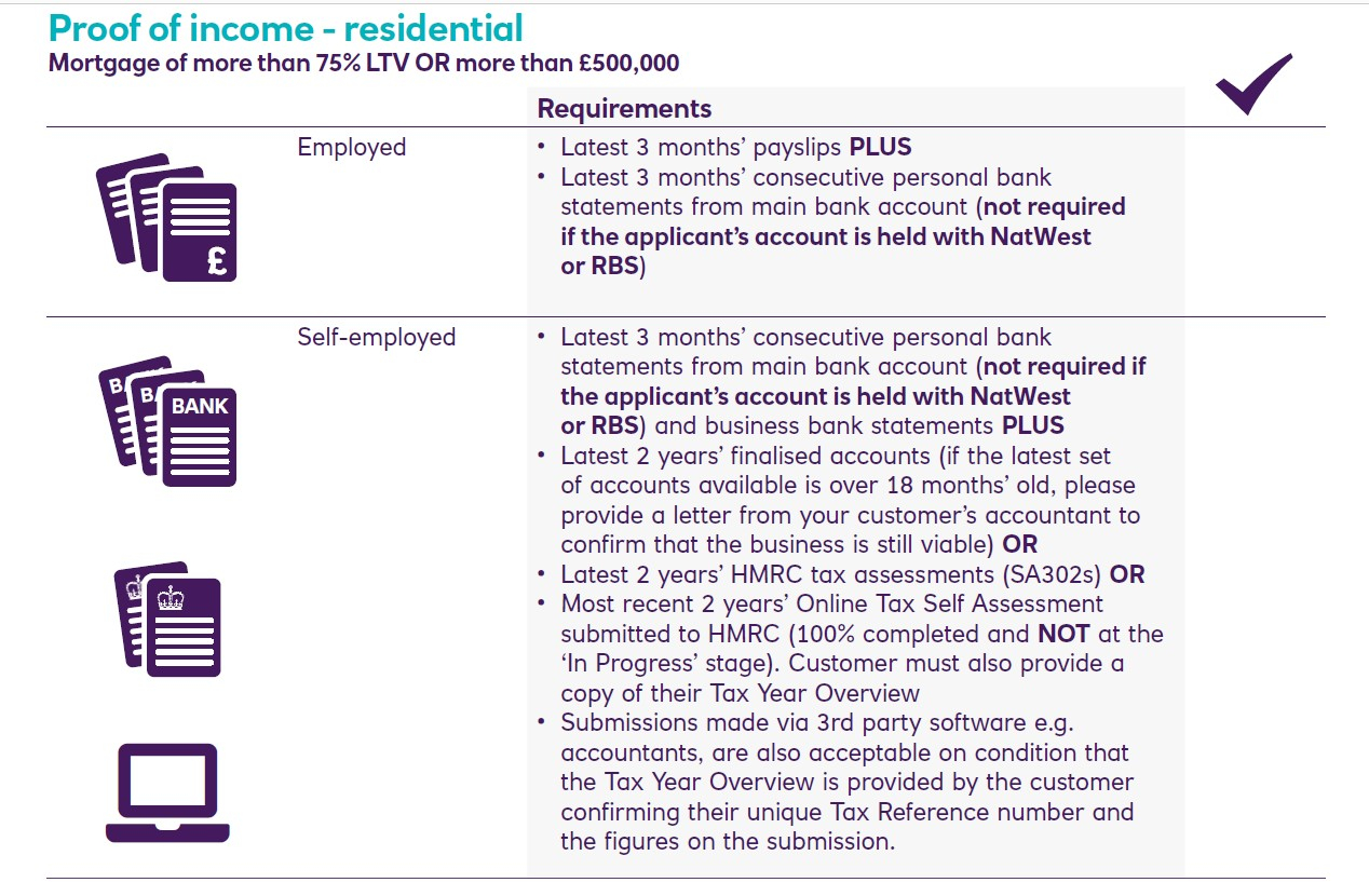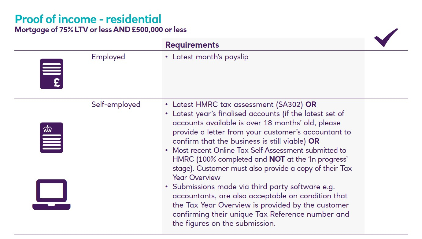 'Proof of income- residential mortgages less than 75% LTV and £500,000, latest HMRC SA302, or latest years accounts'.