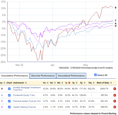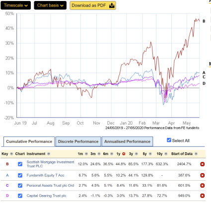 Of course, we know that Fundsmith or Scottish Mortgage could lose 50%+ in a bad couple of years (SMT has lost 70%+ in the past), while it is unlikely that CGT or PNL would do likewise (10-15% NAV drop at the worst of the market turmoil this March). We also know that it is difficult to predict the shape or duration of the next piece of market turmoil and if a 30% drop is not preceded by a 50% rise, or a drop does not recover but flatlines at a low level for a sustained period, then investors could have a Very Bad Time (tm).