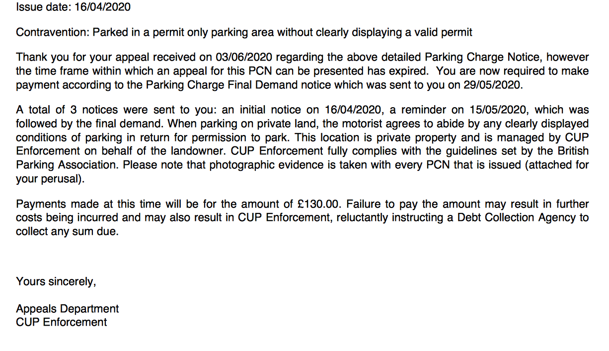 On the parking charge final demand, it states the notice date at 29/05/2020 and alleged date of 10/04/2020