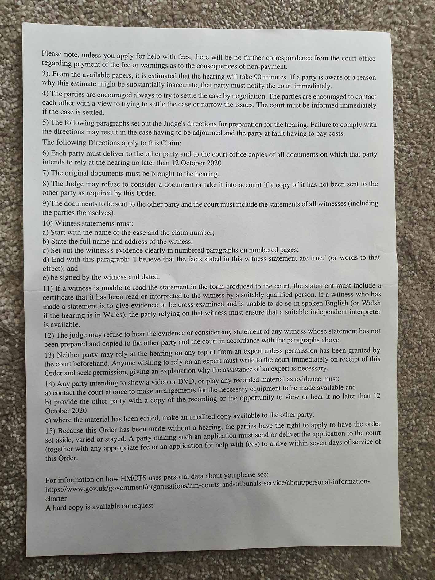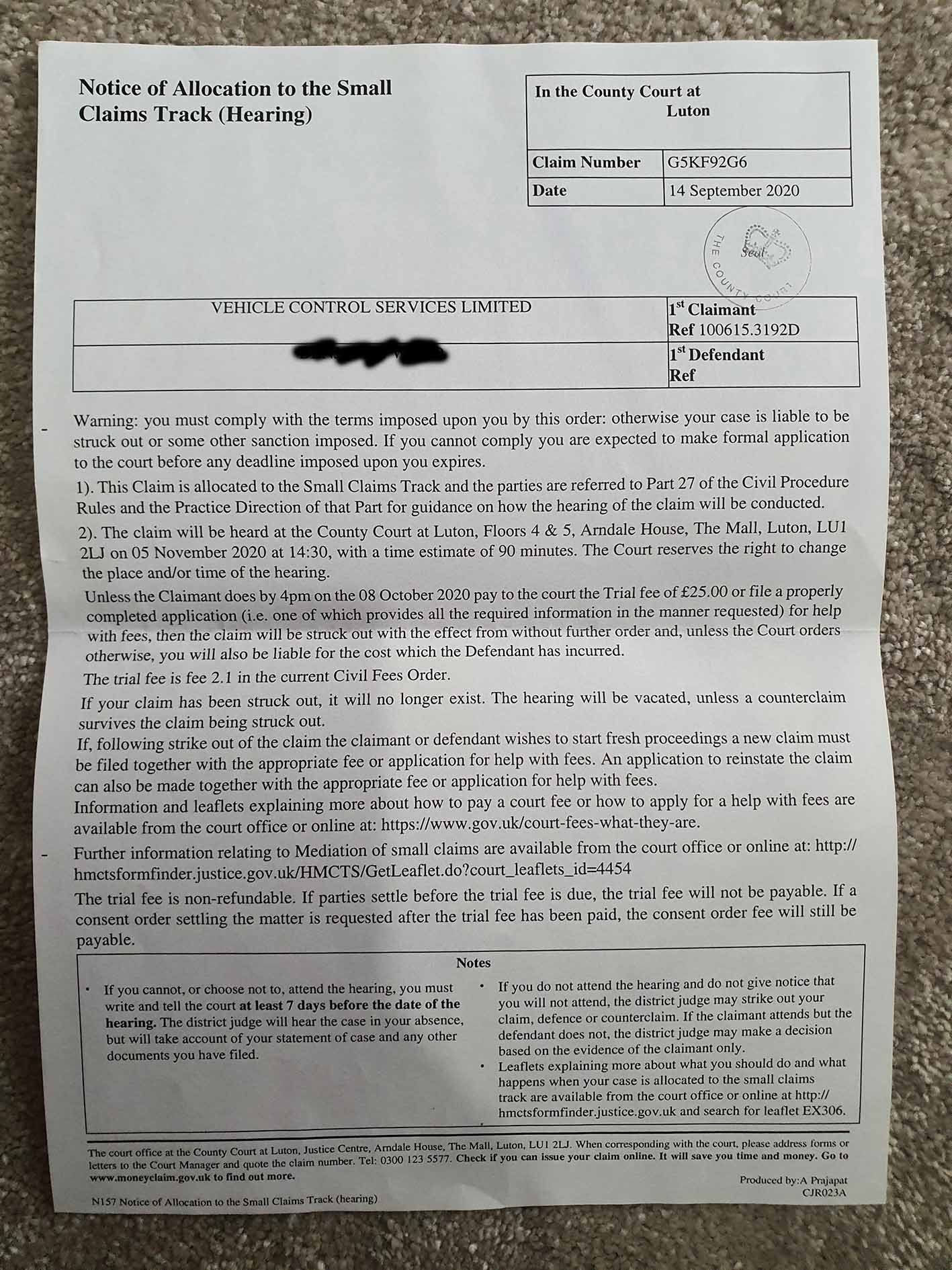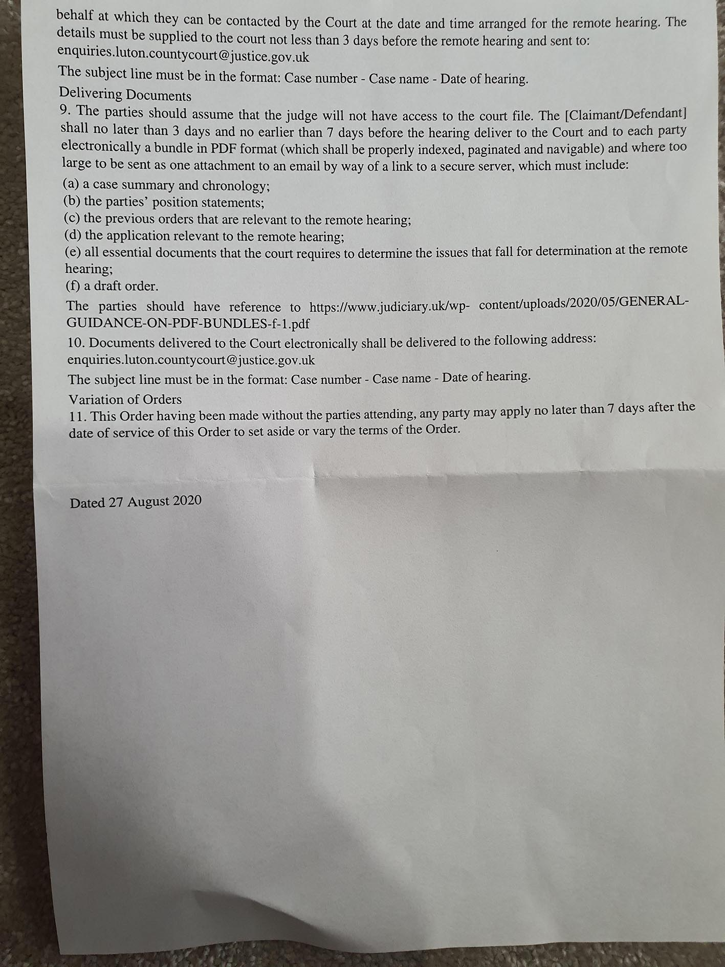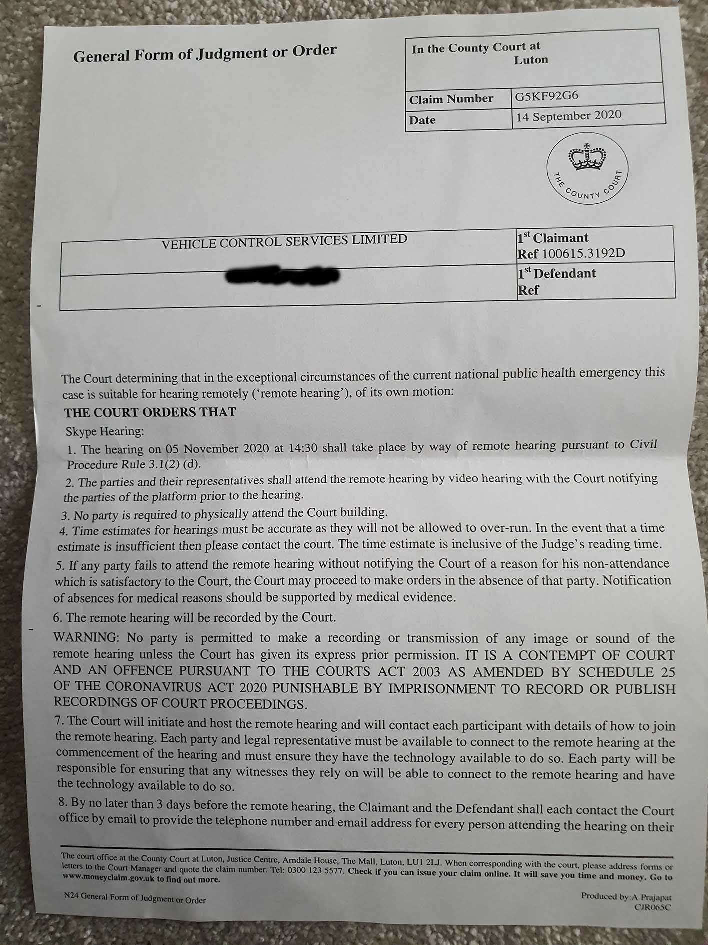 I received a 'General Form of Judgement or Order' from Luton, with a remote hearing date (5th November) and instructions on how to file a 'bundle' for the judge.