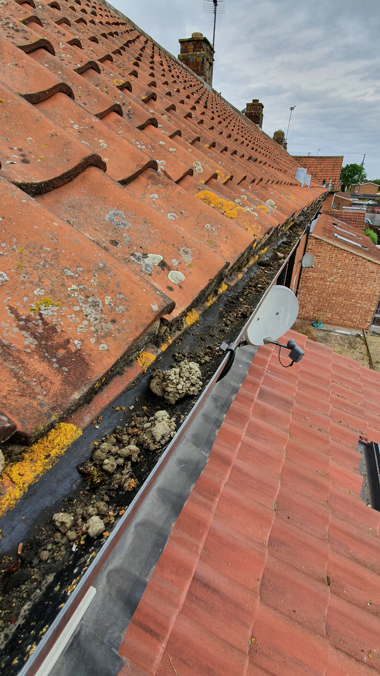 If up on the extension roof we can just about see the gutters and this is what we found. It is full of rubble.. No chance this will wash away, and if it did it would be no good further down the drainage.