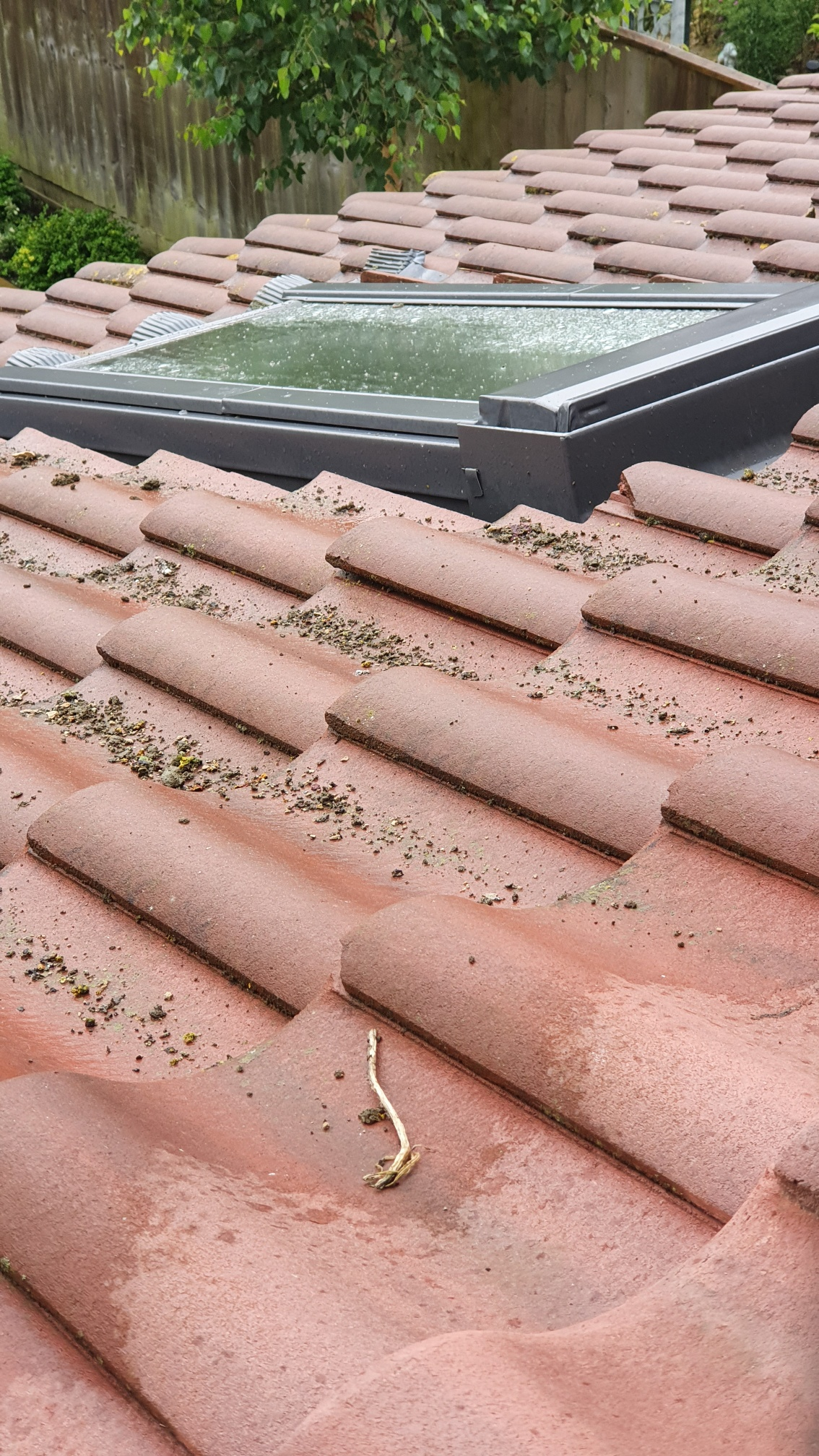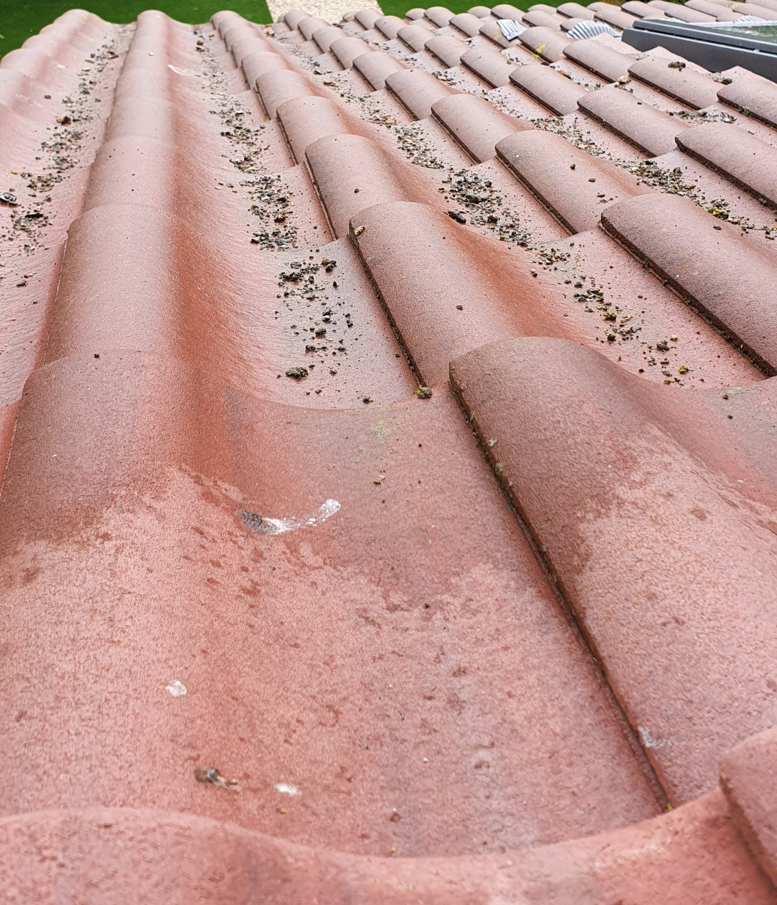 During the process, large chunks of mortar and dust where falling off the roof. The Roofer stated he would clean up the gutters once done. On completion, he stated he cleaned the gutters, although we can't check if this is the case. He has however left the our extension roof looking like this (and the main roof in some sections) and was wondering if this is normal or acceptable. We highlighted this and he stated it will wash away in the rain. I pointed out that it will wash into the gutters and will need cleaning to which he replied it washes away and won't cause a problem and if it did we call him back to sort the gutters.