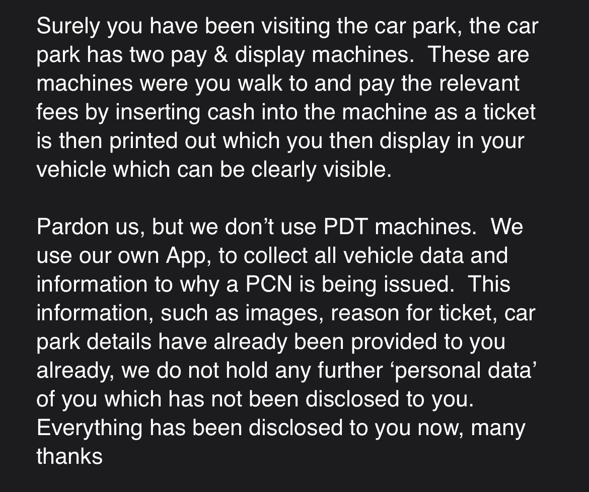 Question - do the machines they're talking about (or rather, the actual machines on this site) require you to enter your vehicle reg (VRM) before issuing a ticket? If yes then their reply is nonsense, and you need to make this clear to them - if no then the PDT logs may be irrelevant as there will be no data of yours stored.Jenni x3 -