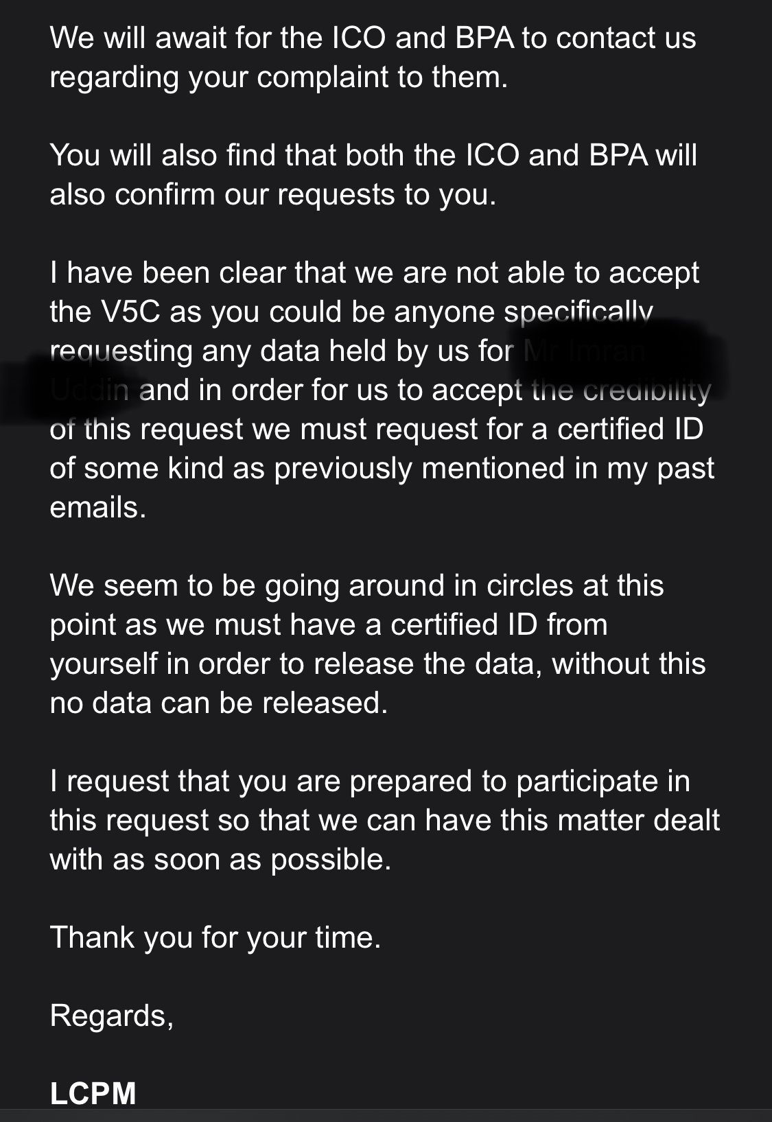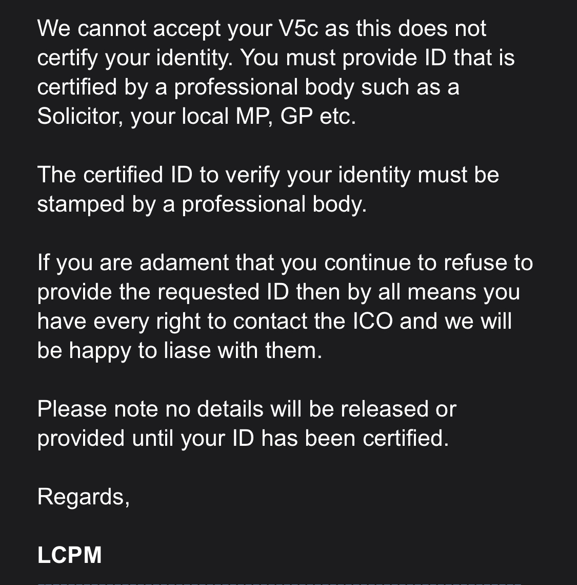 That response is laughable. As @Le_Kirk mentioned above, they were happy to send you the demands for money without proof of ID, when all they had on you was a name and address extracted from the keeper data held by DVLA - the exact same information as is contained on the V5C. 🙄 You providing certified proof of ID doesn't mean you are the same person as referenced on the V5C.
