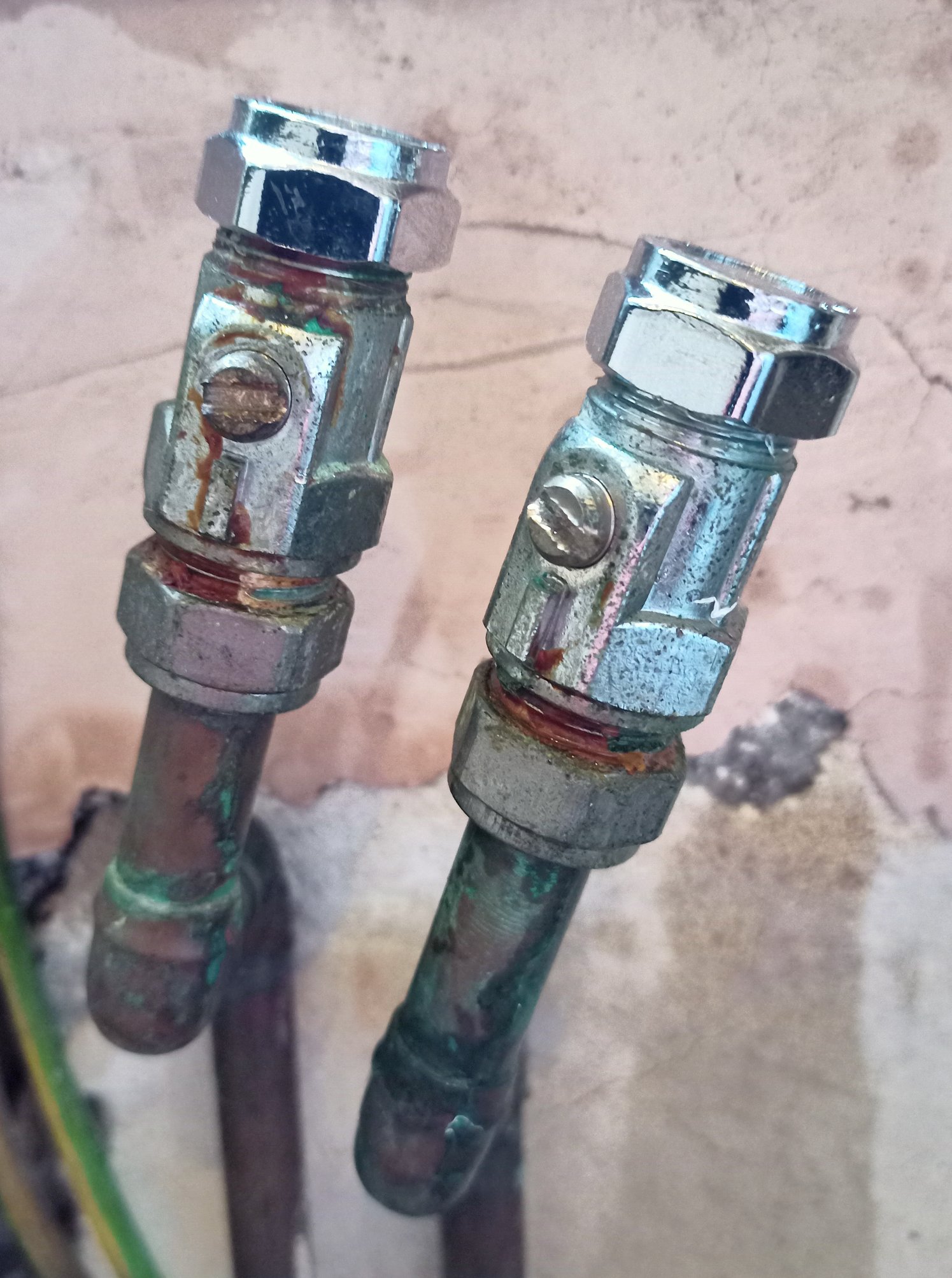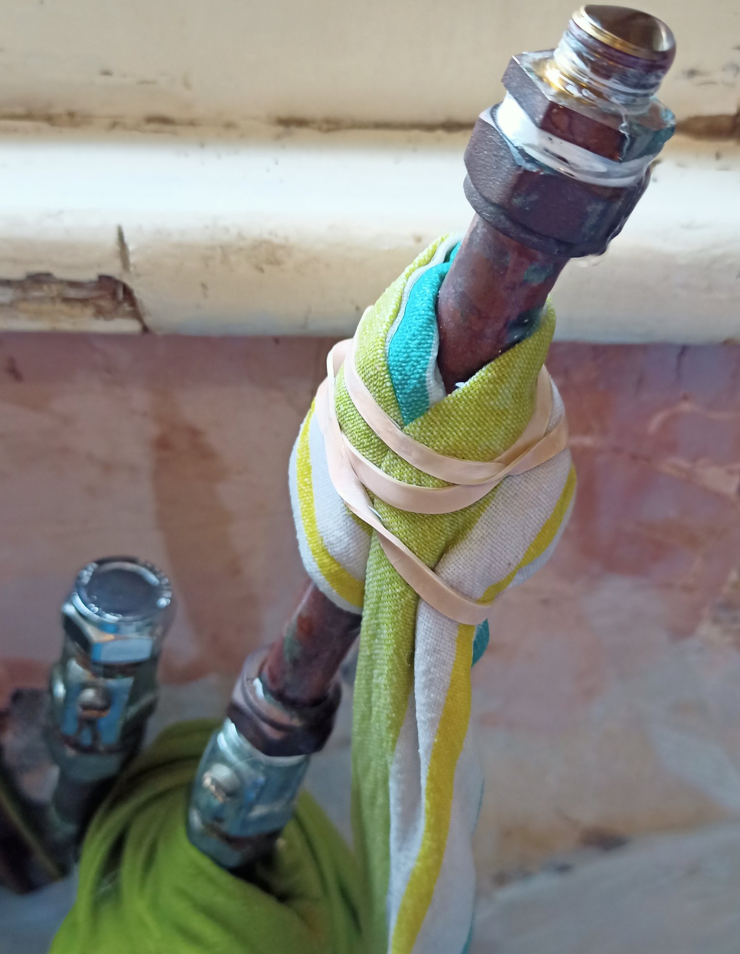 By the way even without turning the water off, could I try removing the section of pipe above the left-hand valve? Since there has never been any water streaming from that one, so the valve must be solid. Then I can have got the practice in, and confirm that the cap fits.Edit: When I try to turn that section that, the valve turns round also. Probably because the white tape has secured it to the pipe above.0