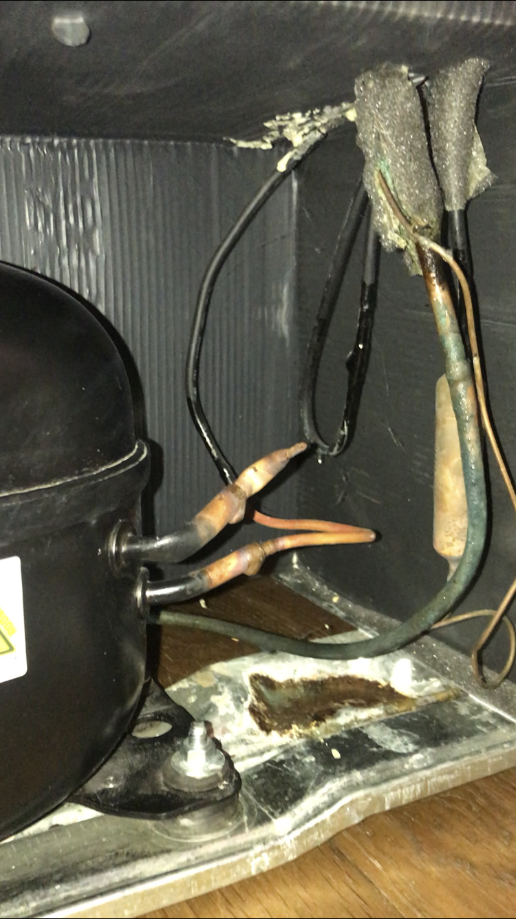 Round the back of the freezer, there is the classic little black domed compressor, and pretty much nothing else - no line that can be unplugged, no tray that can be removed. It does look like some thing has been leaking for a while, since there's a little 'stalactite' build up on one of the tubes going into the compressor, and rust on the metal panel underneath it - but there's no obvious access into that pipe or anything that leads into it.
