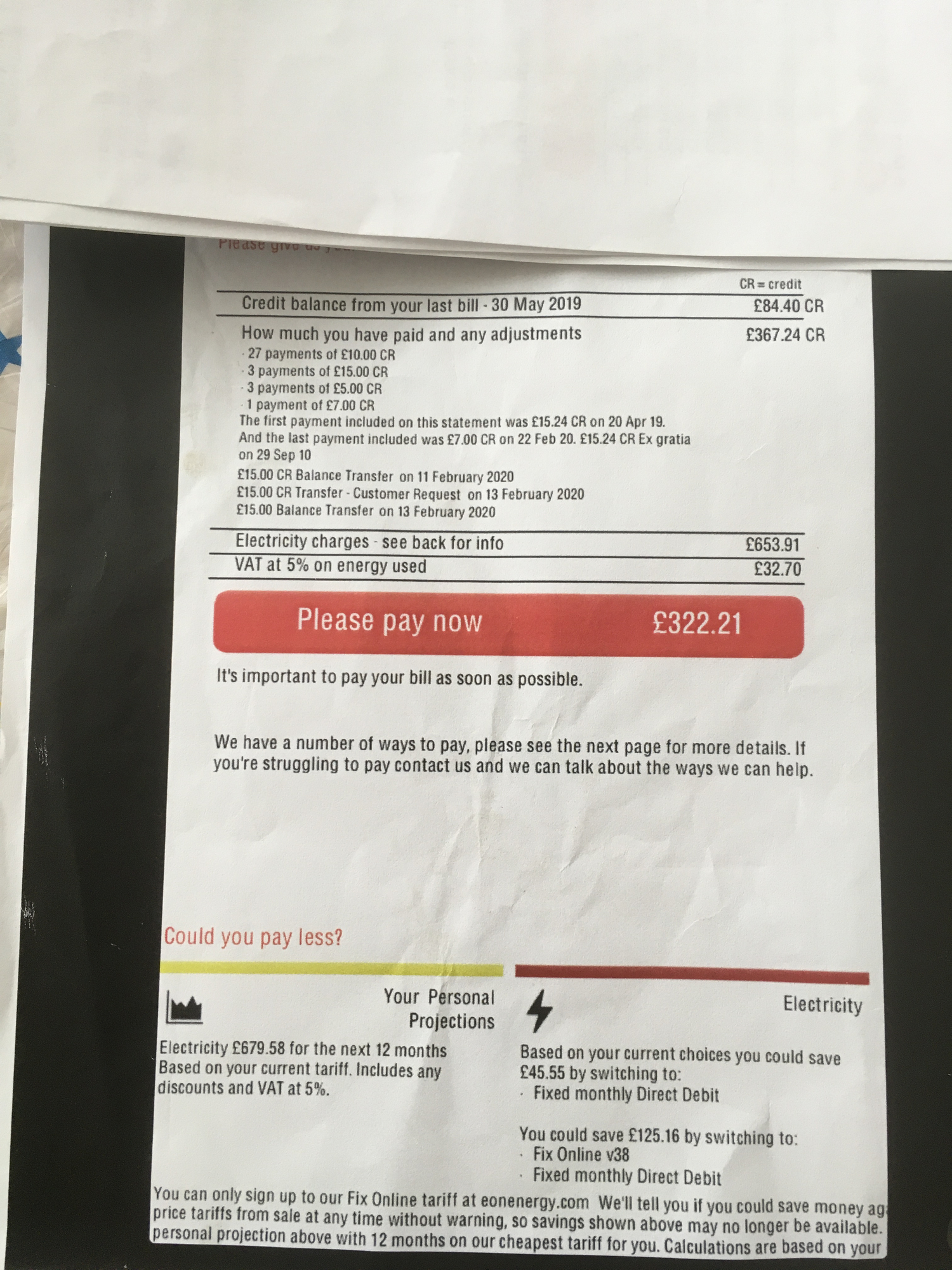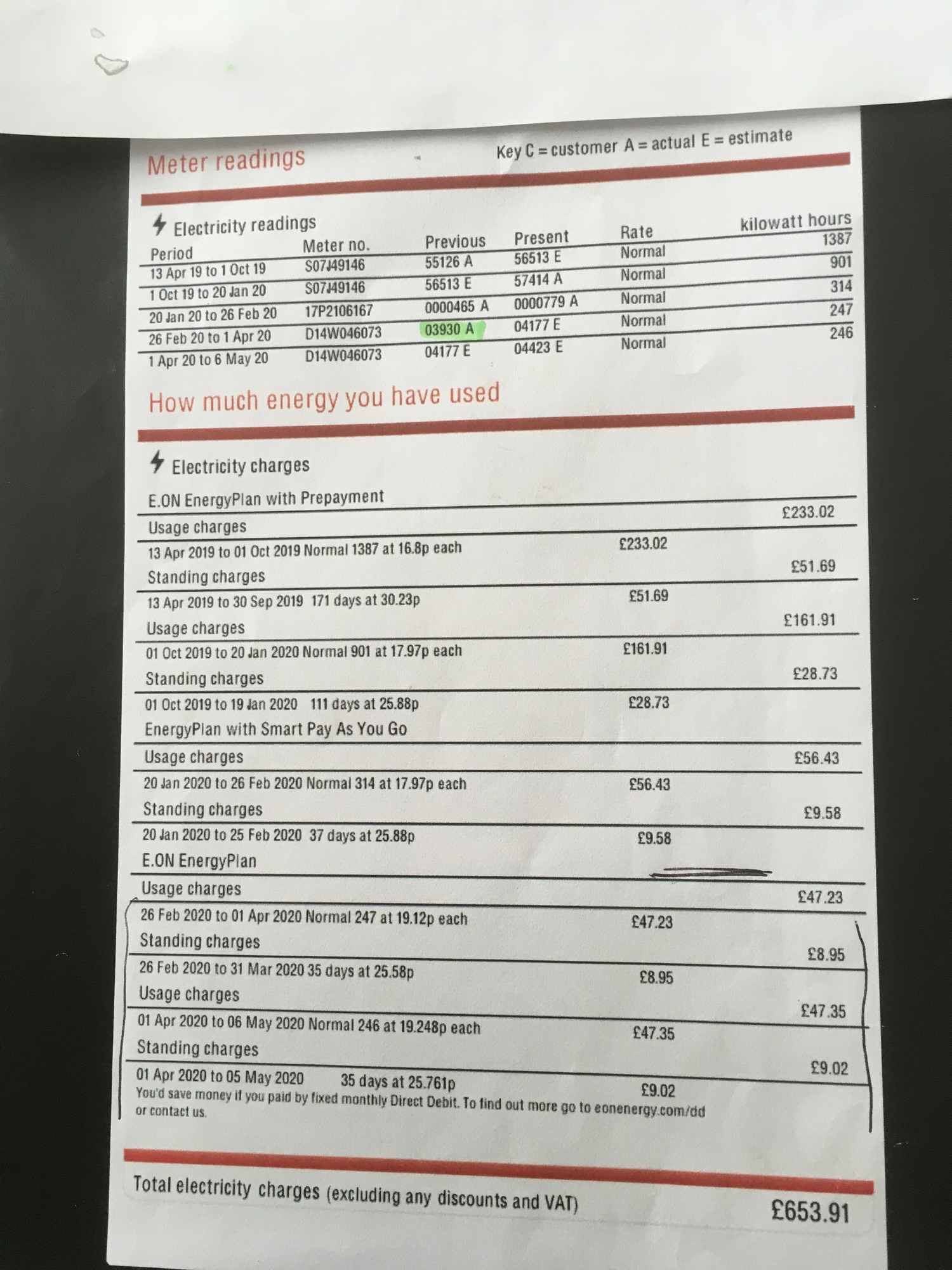 Gerry1 said:The problems are simple. You have a ridiculously expensive electricity tariff, and you haven't sent them monthly meter readings so it IS an estimated bill, just look at all the Es next to the readings.Please read the meter on the wall right now and you'll be able to calculate what you owe, or give us the reading and we'll do it for you.In the meantime you need to switch to the cheapest E.On tariff; once you've sorted it out then it will be time to find a better deal.I sent them my actual reading an my bill has gone even higher it’s Now gone up to £374.71