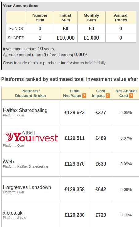 investin1 said:These seem to suggest that it’s very close between all of the companies. It the fact 12 Transactions and 15 almost reverses the list.It almost makes one have analysis paralysisSomething is very wrong with the comparefundsplatforms comparison site. See the example of putting £10k in a single ETF and then making monthly £1k buys with no other trades.iWeb: Actual cost = £25 opening fee + £5 x 12 months x 10 years = £605. Comparison says £919.Halifax Sharedealing: Actual cost = £12.50 initial purchase + £12.50 ISA admin x 10 years + £2 x 12 months x 10 years = £377.50. Comparison says £548.If the simple scenario is wrong, expanding it to two funds is no more likely to be correct.