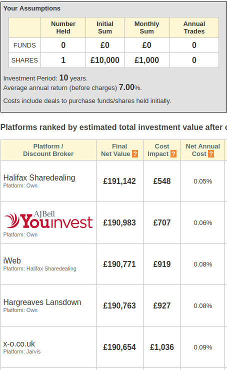 dont_look_now said:masonic said:Something is very wrong with the comparefundsplatforms comparison site. See the example of putting £10k in a single ETF and then making monthly £1k buys with no other trades.iWeb: Actual cost = £25 opening fee + £5 x 12 months x 10 years = £605. Comparison says £919.Halifax Sharedealing: Actual cost = £12.50 initial purchase + £12.50 ISA admin x 10 years + £2 x 12 months x 10 years = £377.50. Comparison says £548.It is telling us the "Cost Impact", not the direct costs.This means ... You would be paying £377.50 to Halifax in charges. But now imagine Halifax charged nothing. How much more would the value of your final investment be? All that money not paid to Halifax (at various different dates over the 10 years of the investment) would be invested, at an assumed rate of return of 7% per annum. Hence the final value of your investment would be increased by more than £377.50, and in fact (apparently) the increase would be £548.I haven't attempted to check their calculation on that basis, but their figures look plausible to me.Yes, it looks like that's what they are doing - adding on the opportunity cost of paying fees out of the portfolio, which can be avoided by setting growth to 0%: