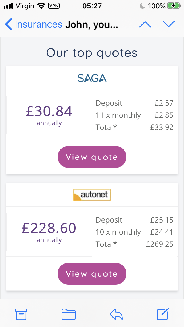 The money supermarket site pointed me towards a fully comprehensive policy for my Mini for, wait for it, £30.84 annually! Even better this price will apply for three years unless my circumstances change. Obviously I took up the offer any my policy is in place. I thought £30.84 would have been a reasonable monthly payment for a blue chip insurer.