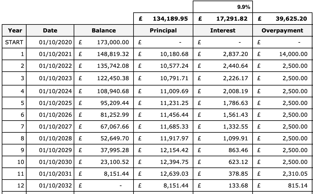 4) For simplicity I'll assume you can get 1.64% for the rest of his mortgage term, let's also assume you pay that 14K toward principle amount and every year overpay by 2.5K or max 10%, you'll save £6,449.37 in interest and finish your mortgage in 12 years.