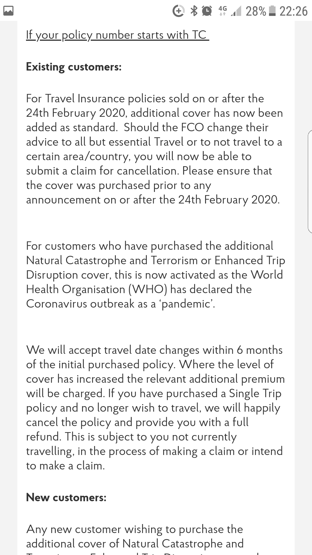 From their own website, I took a screenshot on my phone "for travel insurance policies sold after the 24th February 2020, additional cover has now been added as standard. Should the FCO advise change to all but essential travel or not to travel to a certain area / country, you will now be able to submit a claim for cancellation. Please ensure the cover was purchased prior to any announcement on or after the 24th February 2020."