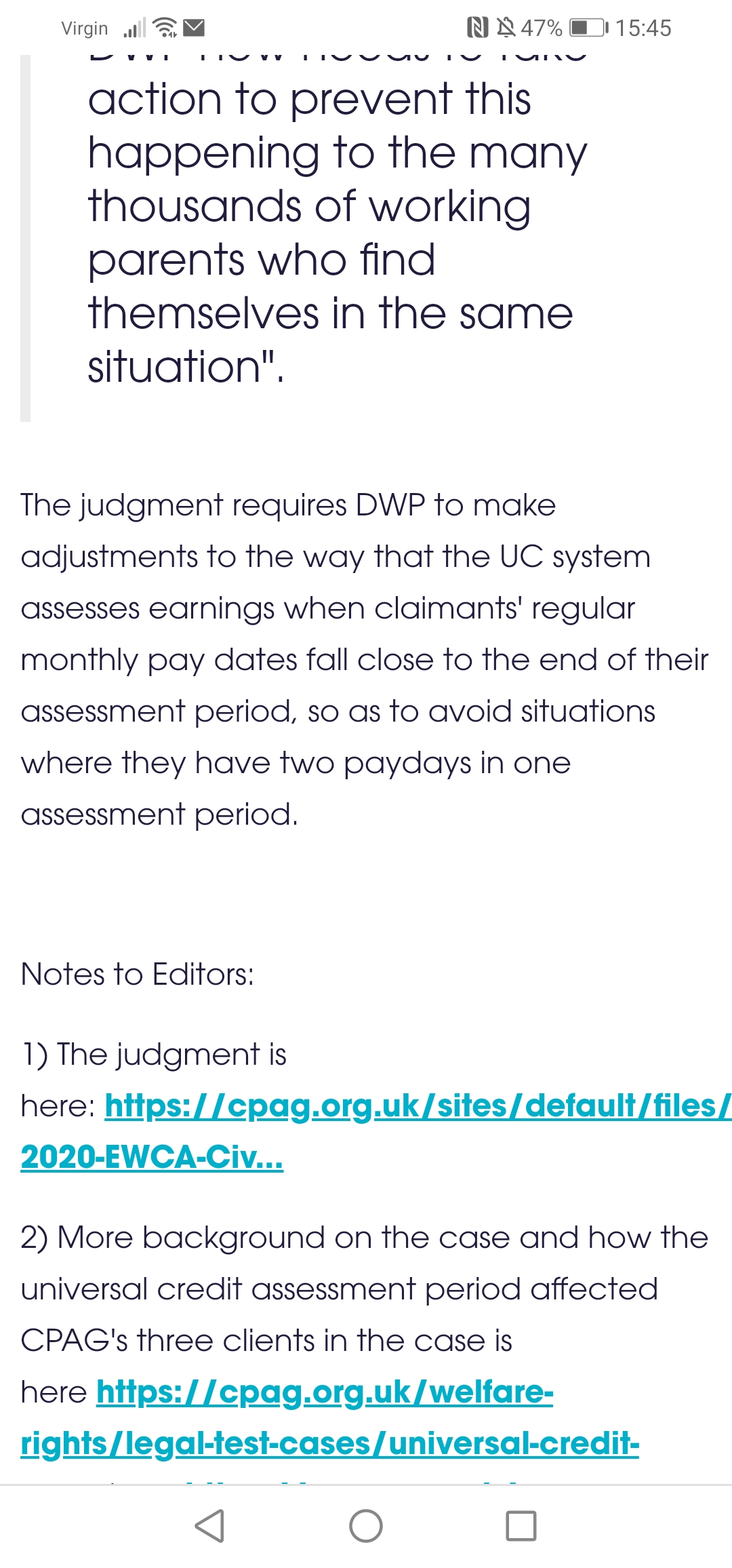 No that is wrong. The case related to claimants paid monthly who sometimes had two payments fall within one AP if they were paid a few days early due to bank holidays etc. This means in some months that had double earnings and the following month none. This did indeed mean they lost out on the Work Allowance in the nil month. That was founded to be irrational.TheShape said: