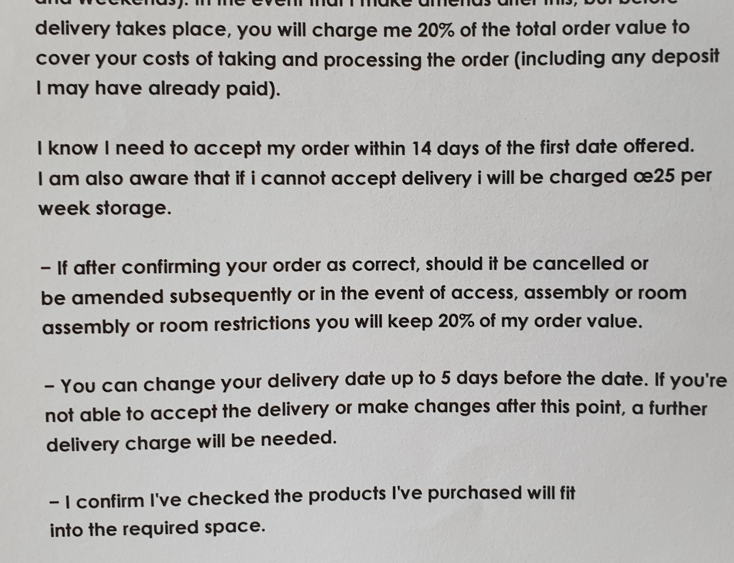 On speaking to the company about cancelling the headboard we were drawn to their T&Cs stating a change of mind is only valid within 24 hours and if after that time you are subject to a 20% handling charge on the TOTAL amount?