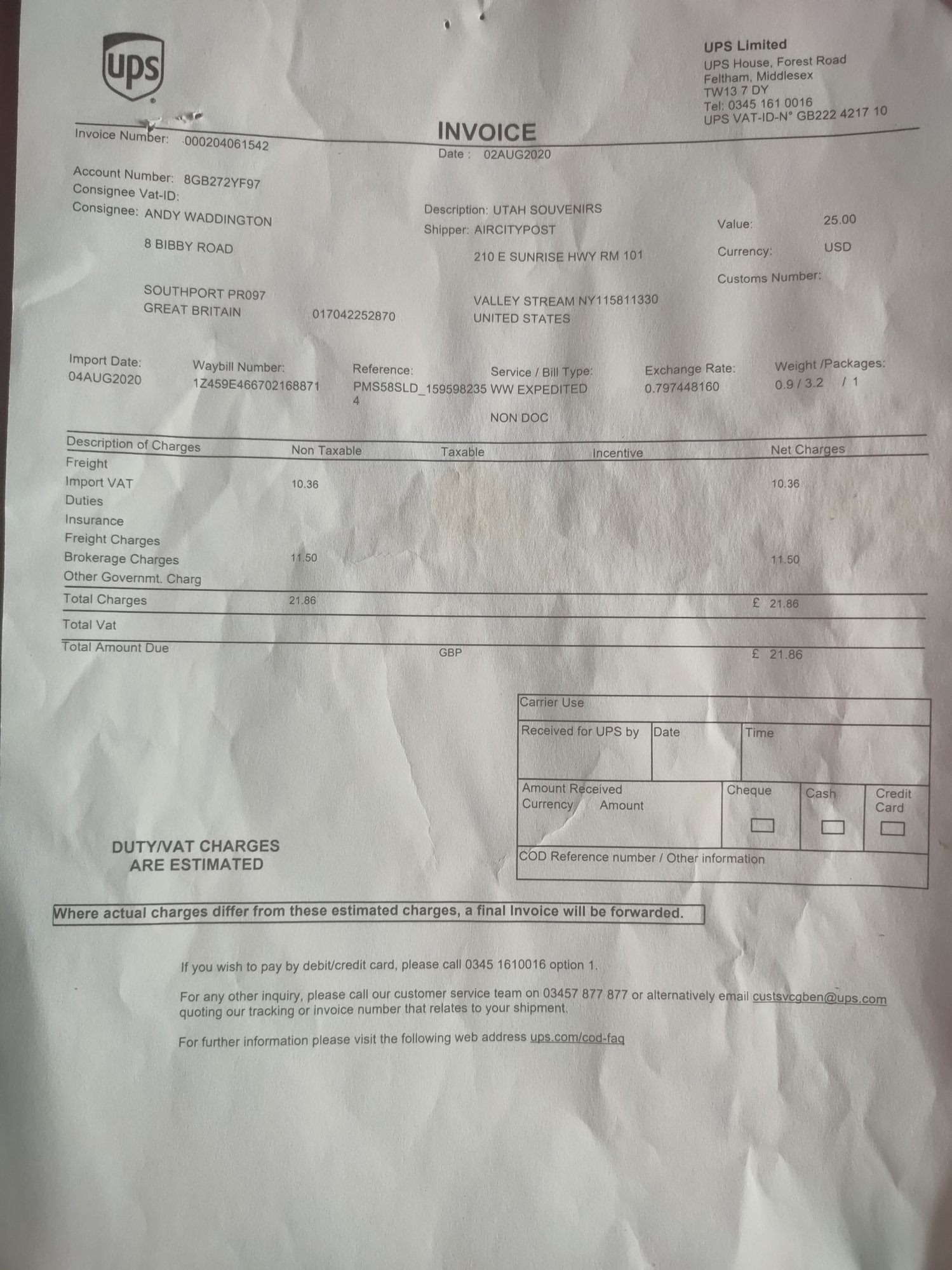 Freight Import VAT £10.36.Brockerage Charges £11.50