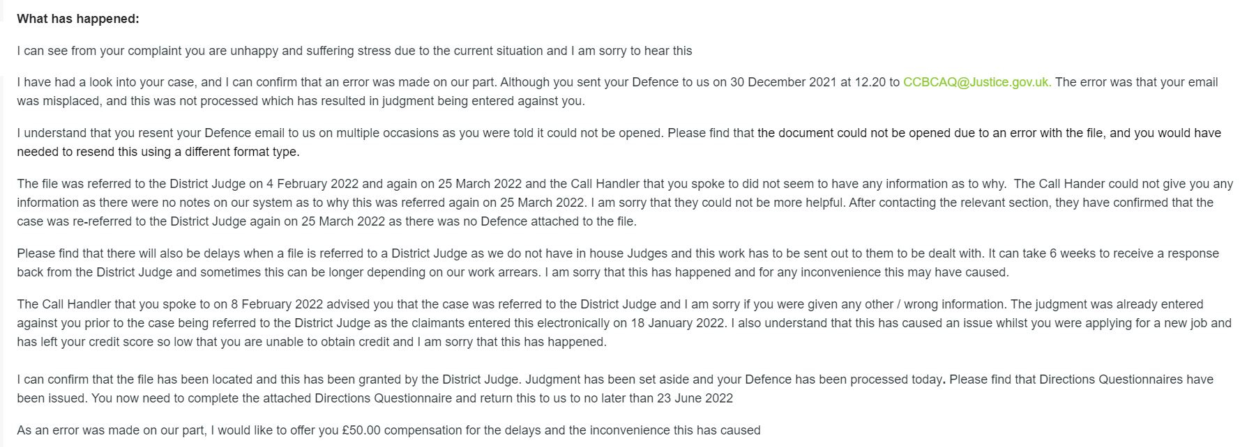 Update on my complaint! Court has finally held their hands up to say they did get my defence and the CCJ has been removed for now. In summary, they lost the original defence, then they forgot to attach it when re-sending it and didn't leave any system notes either.