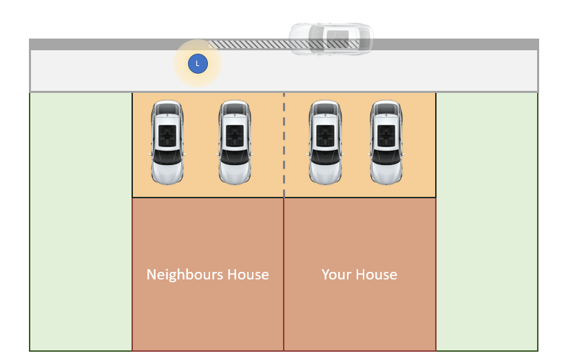 Not sure why I did this but I made a clipart-y version of your drawing. Bit of question seems to be how your visitors park along the drop kerb / length of kerb. This is how I am imagining it based on the posts - is this right?