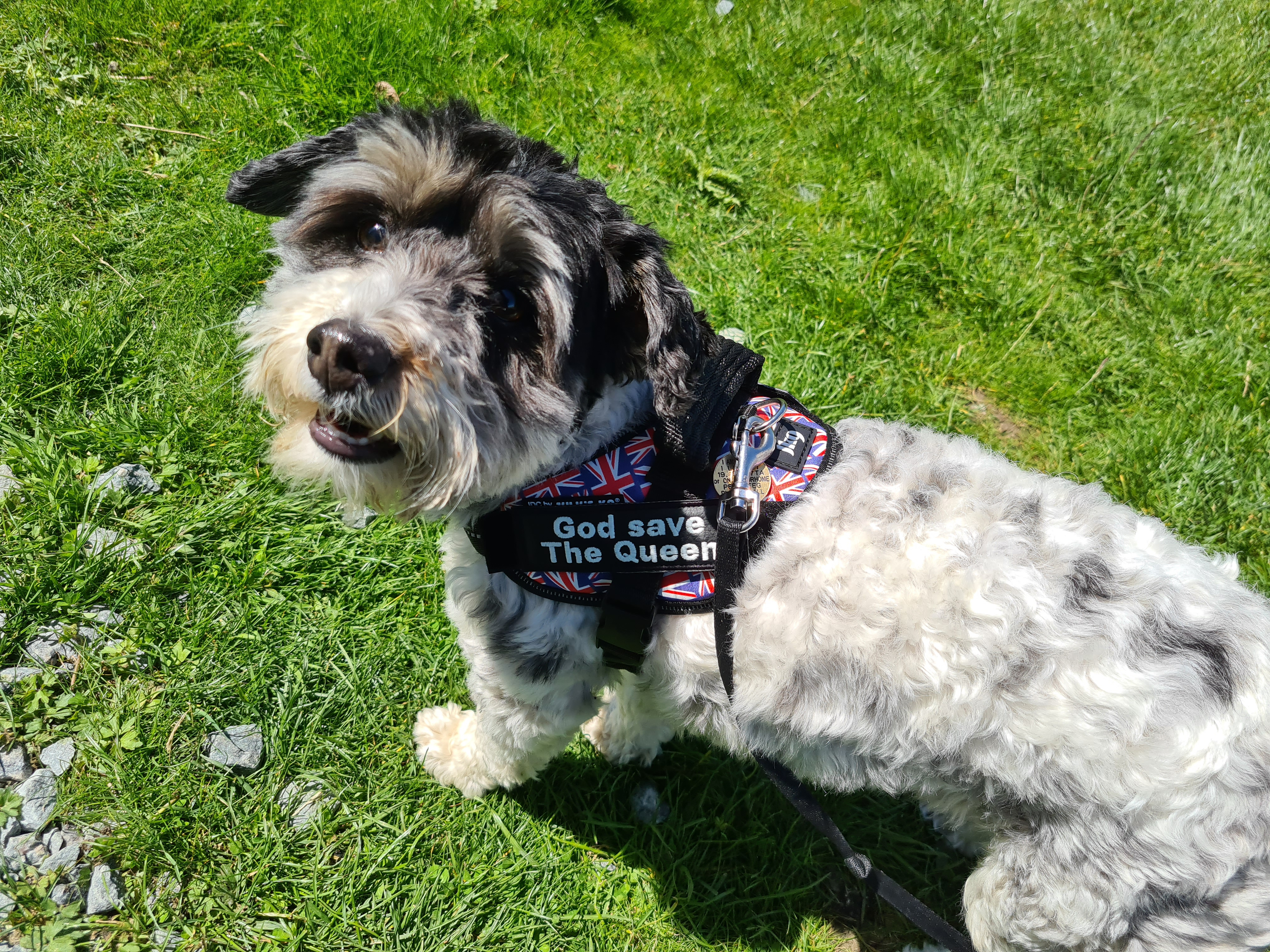 We have now got ourselves settled in in the site. Bunting up. Dog wearing his new harness.