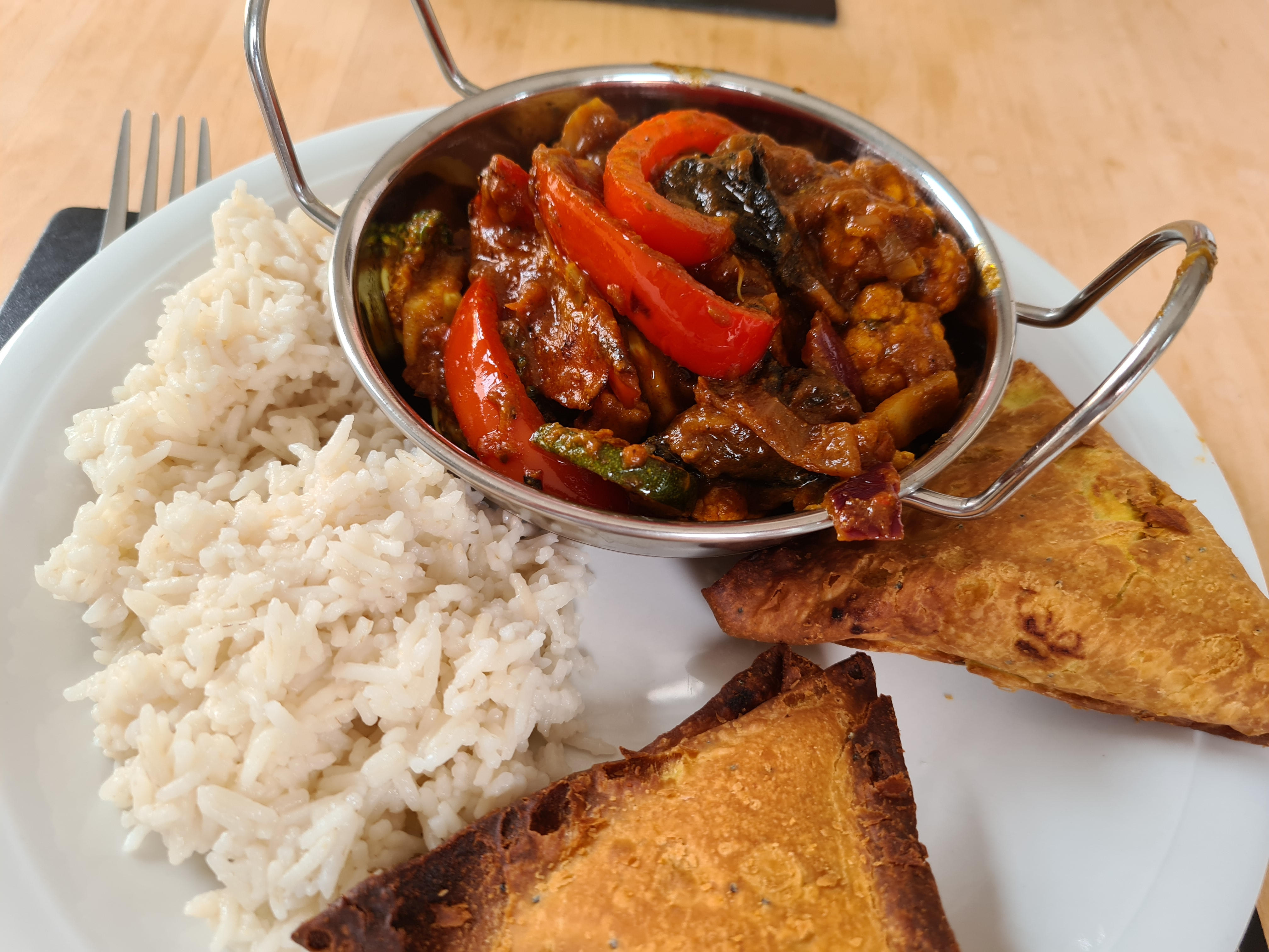 Breakfast, lunch and dinner will be from stores. Breakfast was toast, we have both taken our packed lunches to work and dinner tonight will be pork jalfrezi made with the leftovers from yesterdays Sunday dinner served with pilau rice, onion bhaji and vegetable samosa.