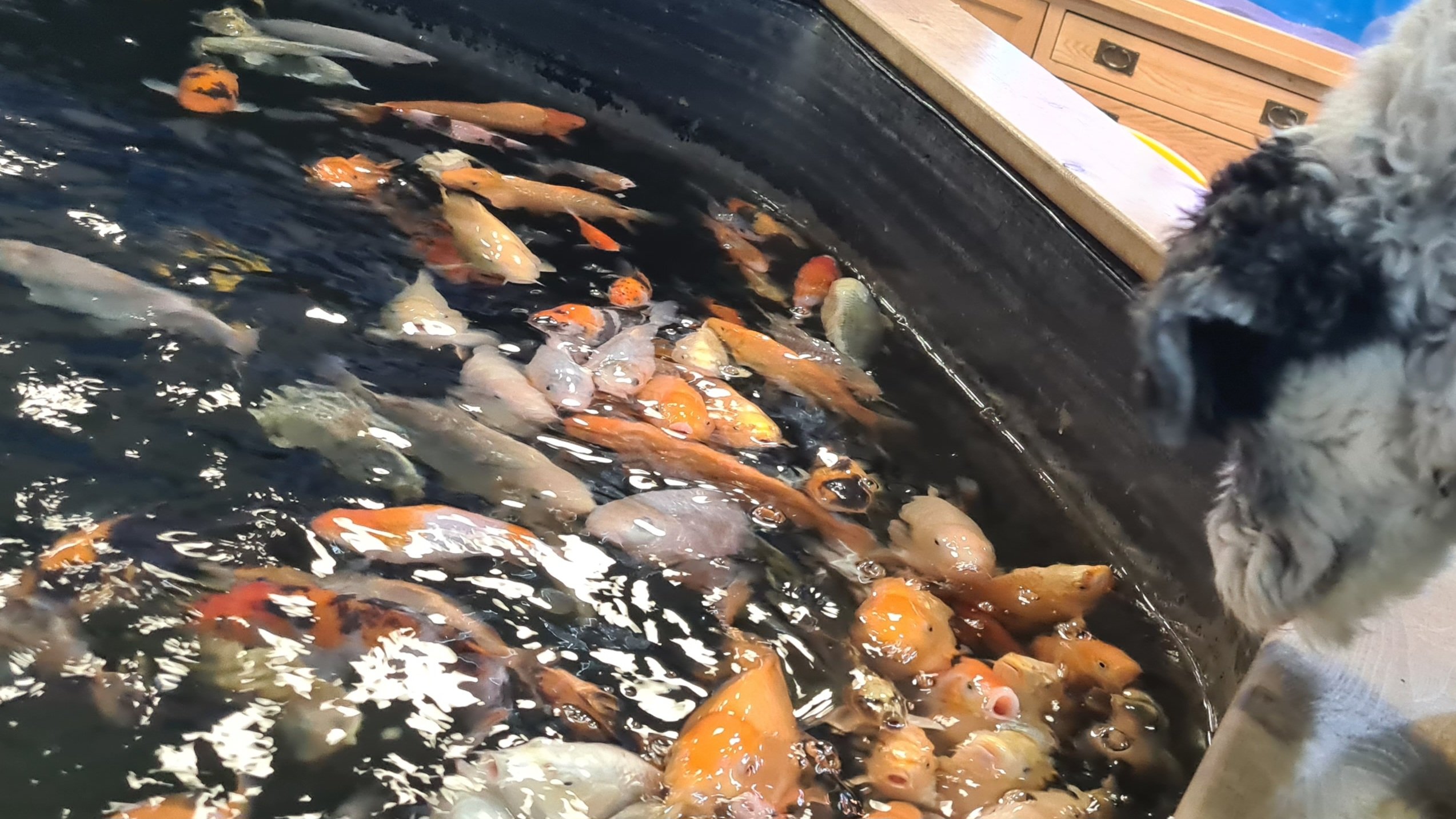 The staff in the aquatics shop find it hilarious how much our dog loves the fish. He is like a cartoon dog on the slippery floor going towards the koi pool 🙈1 -