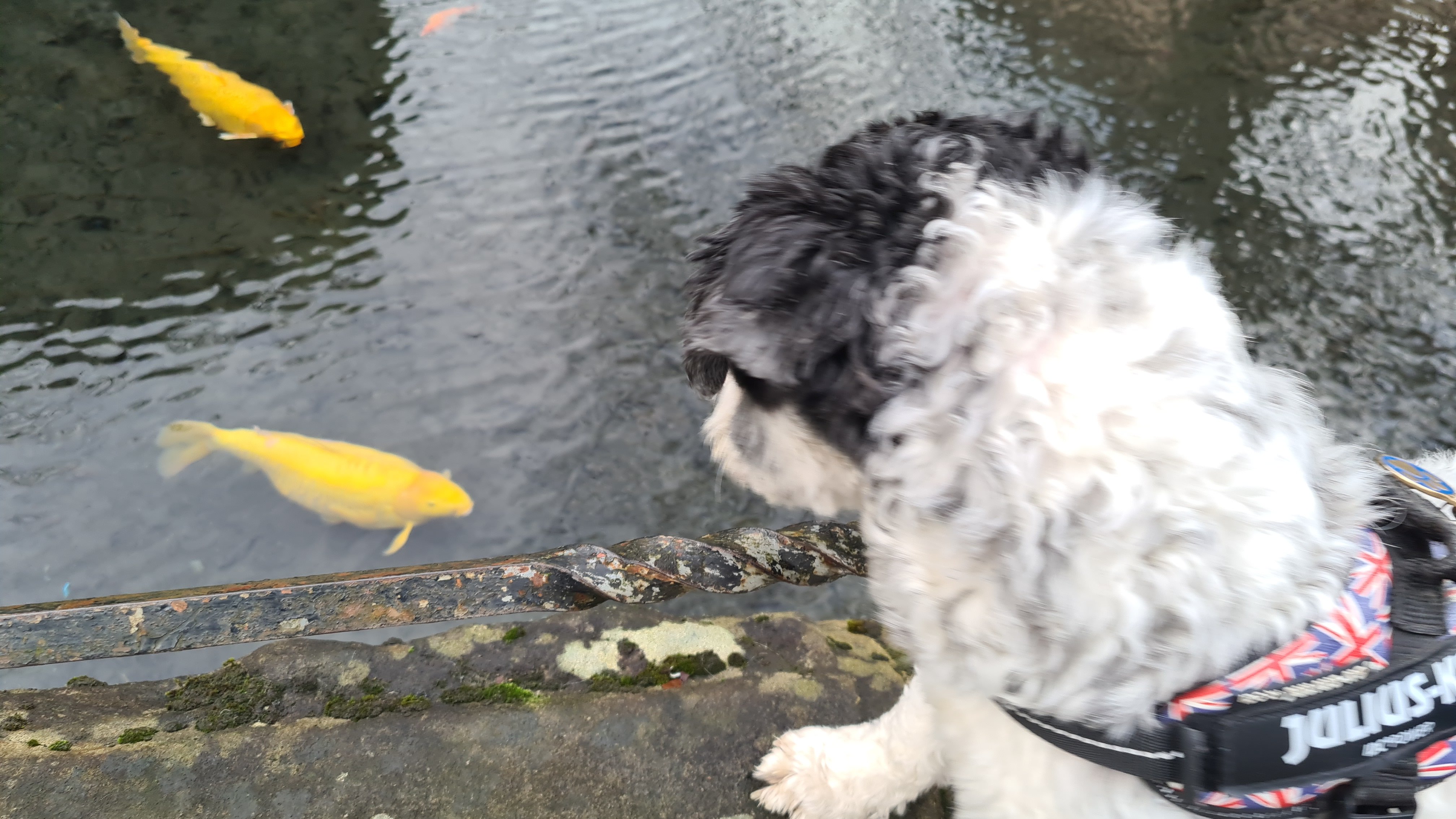 The dog is happy now he has seen the fish. Have never known a dog so obsessed with fish.
