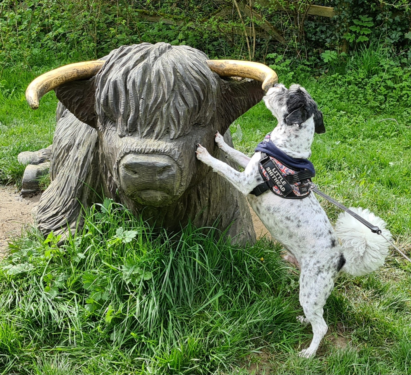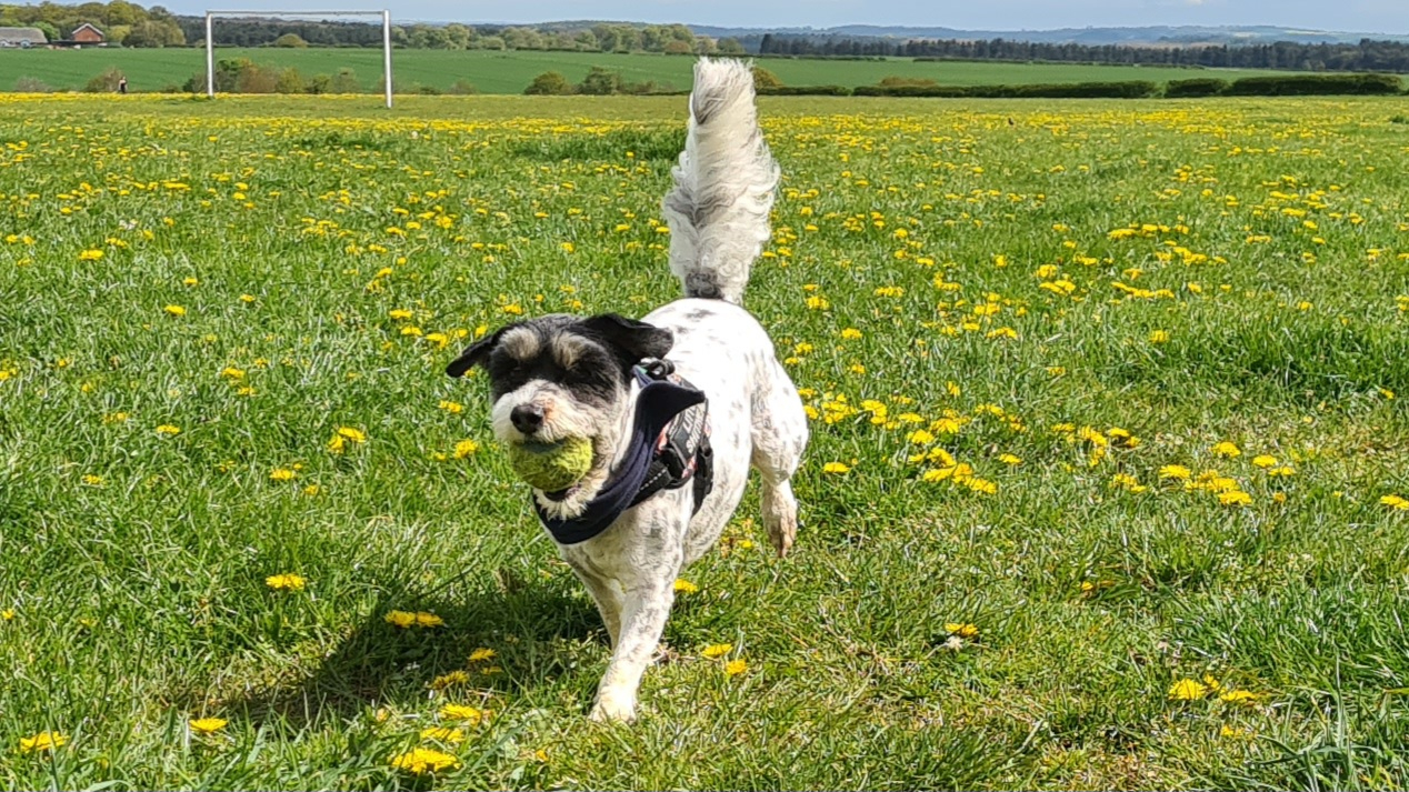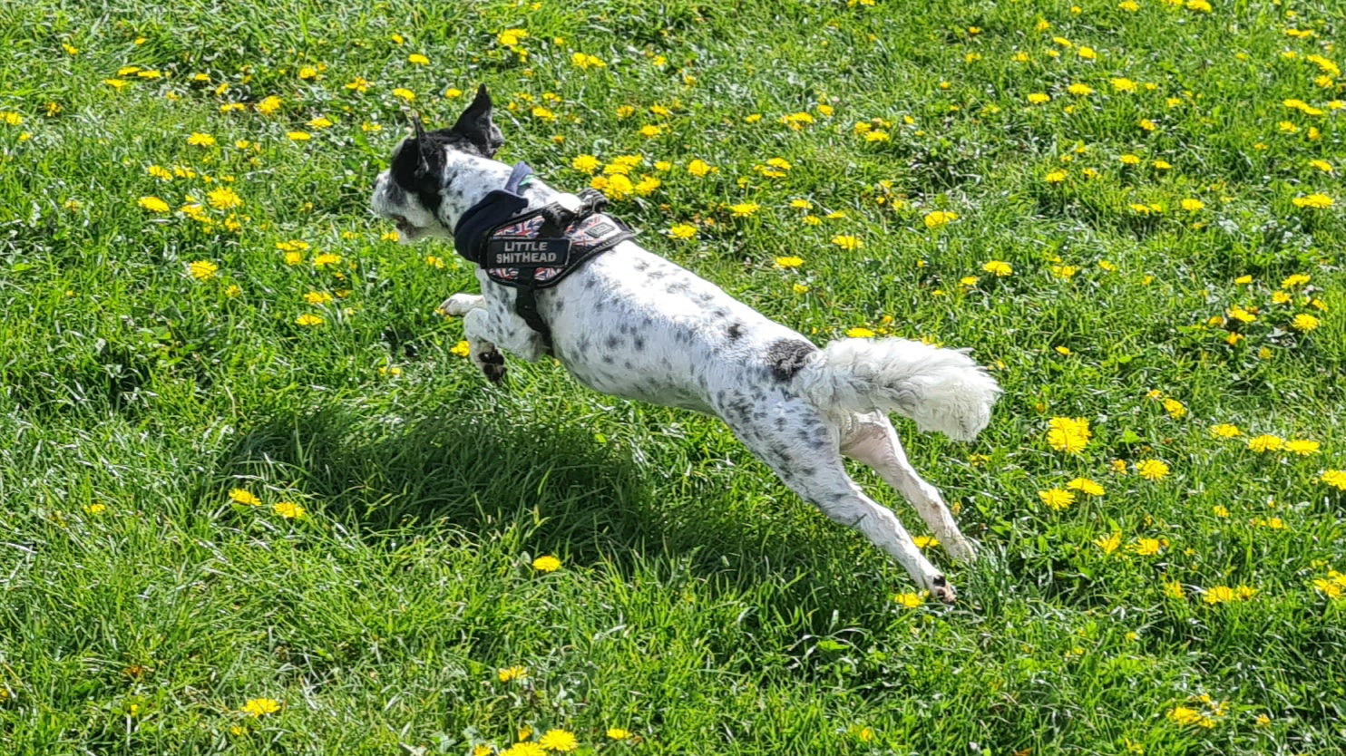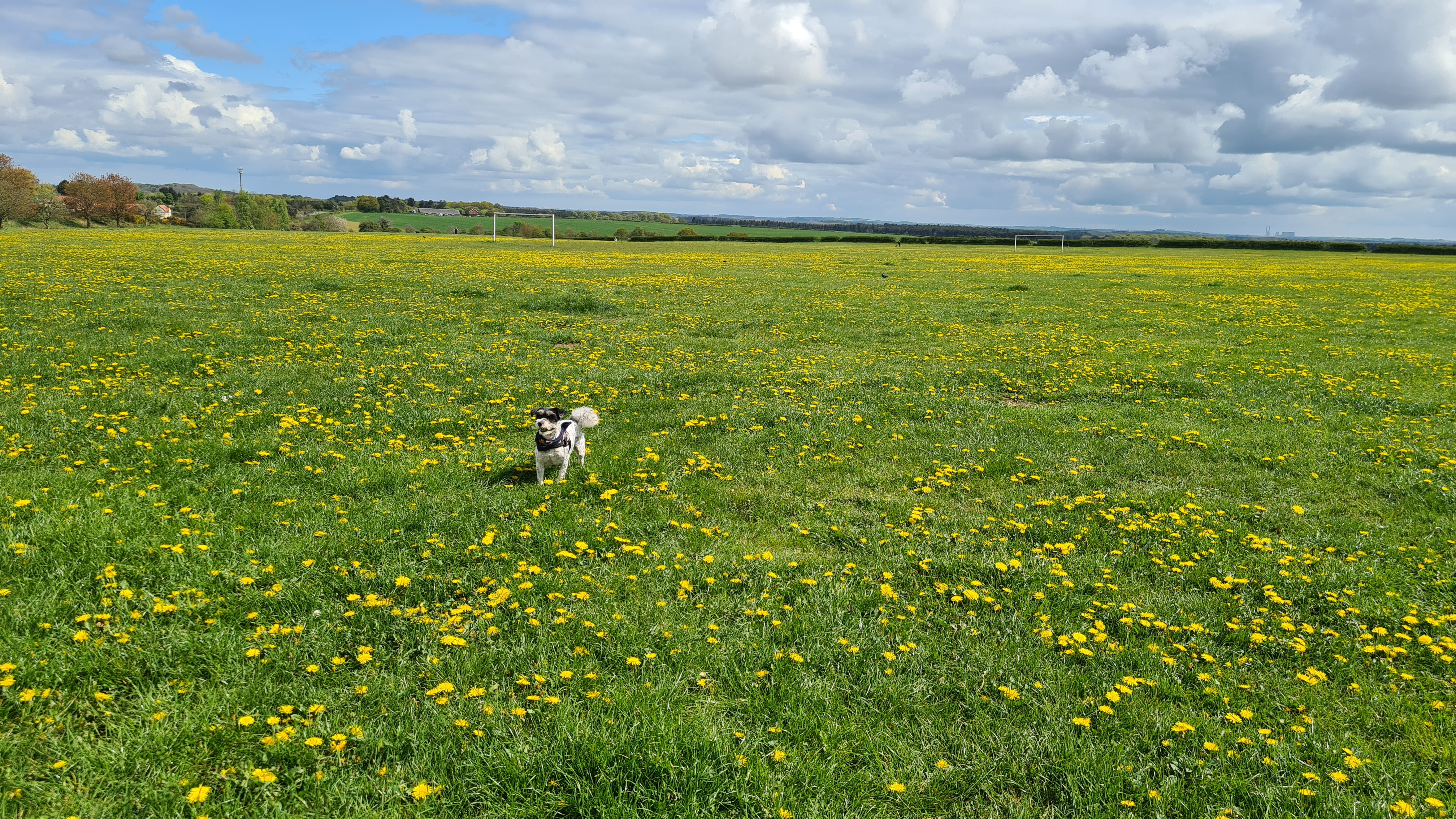 The dog had had a good run on the field. He now has yellow legs from the Dandelion pollen 🤣🤣🤣