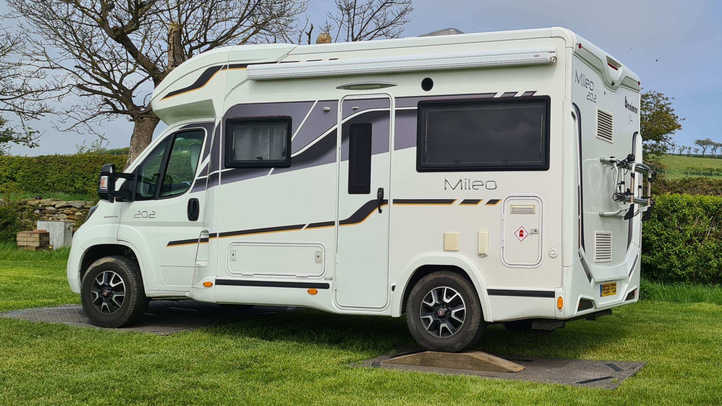 The site here is lovely. Very sloping but the owners have loads of ramps ti make sure you are level and they have put mats down so we don't sink into the grass.