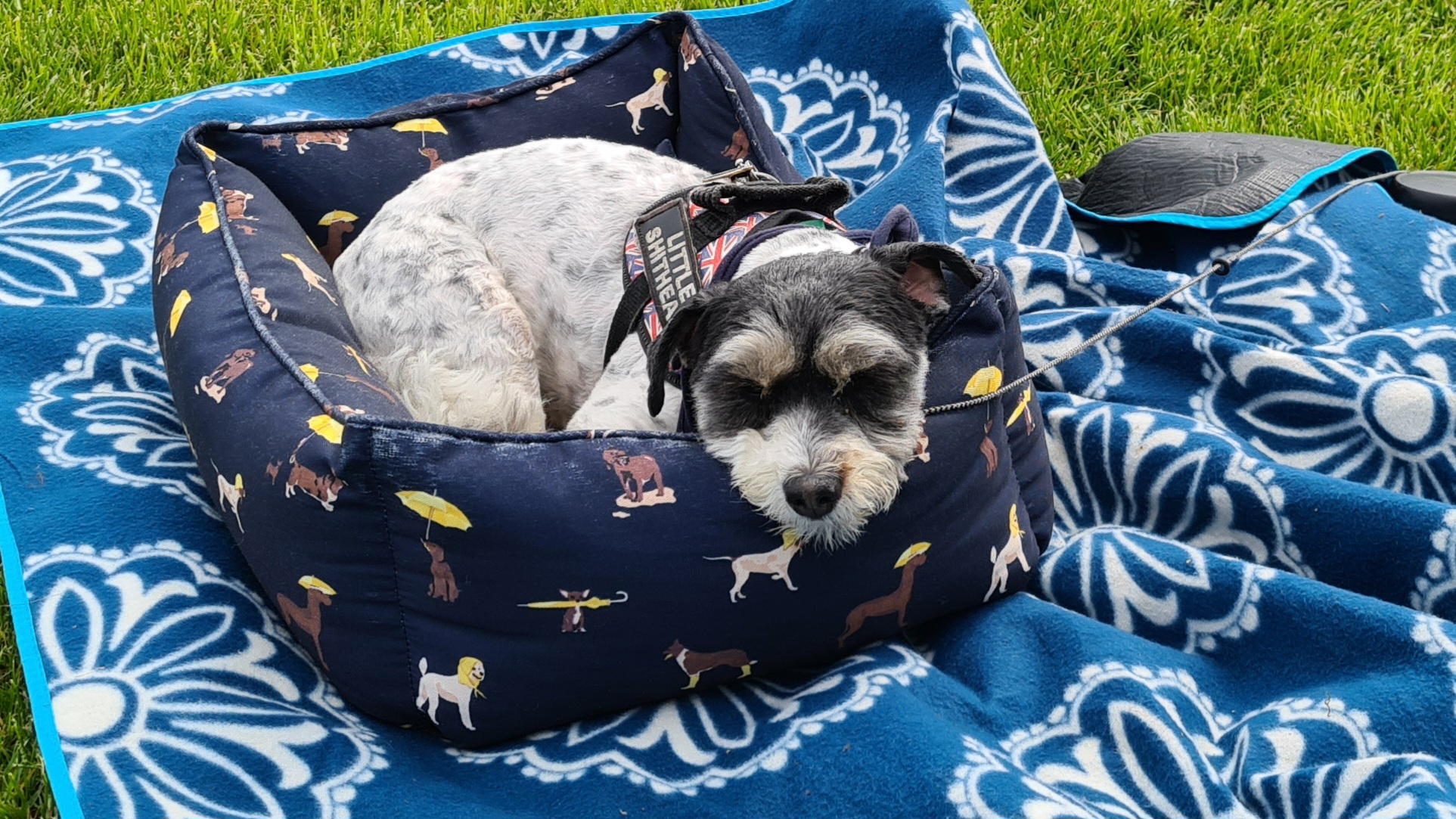 The dog is curled up in bed again now. He is still tired.