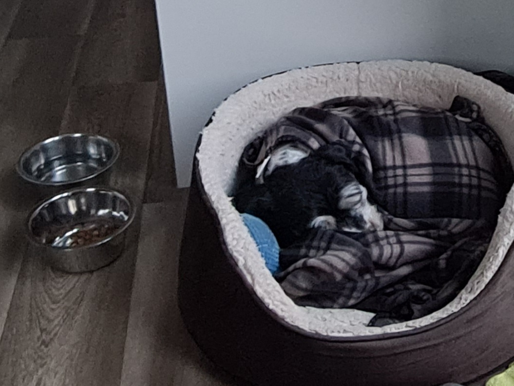 The dog is now fast asleep in his kitchen bed. Dont think we will see much of him for the rest of the day.