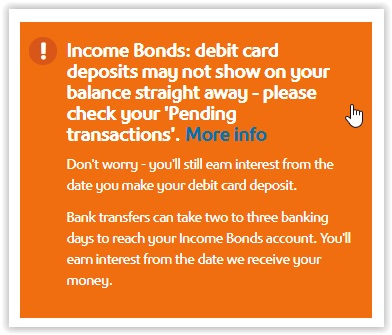 Thanks for the clarification. I paid by debit card. That'll teach me to read all the bumf. I obviously misinterpreted the head of the web page which says "Bank transfers can take two to three banking days to reach your Income Bonds account. You'll earn interest from the date we receive your money." Maybe this needs to be a little clearer for non-bankers !eskbanker said:
