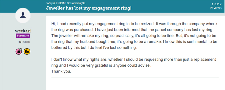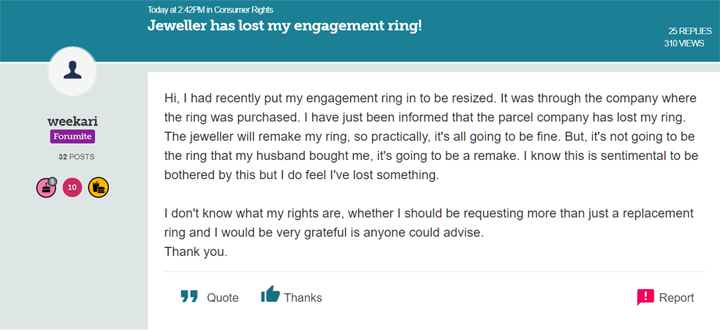 Quite the opposite - most companies choose to self insure over a certain value so they’re probably massively out of pocket.weekari said:My point in asking is that the jeweller will receive compensation from the delivery company, presumably the retail value, not the cost value. It would have been insured. Therefore, they have essentially made money from this. I however don't feel I am better off. I feel I am worse off as I no longer have the original ring, I have a replica, a copy, at no fault of mine.