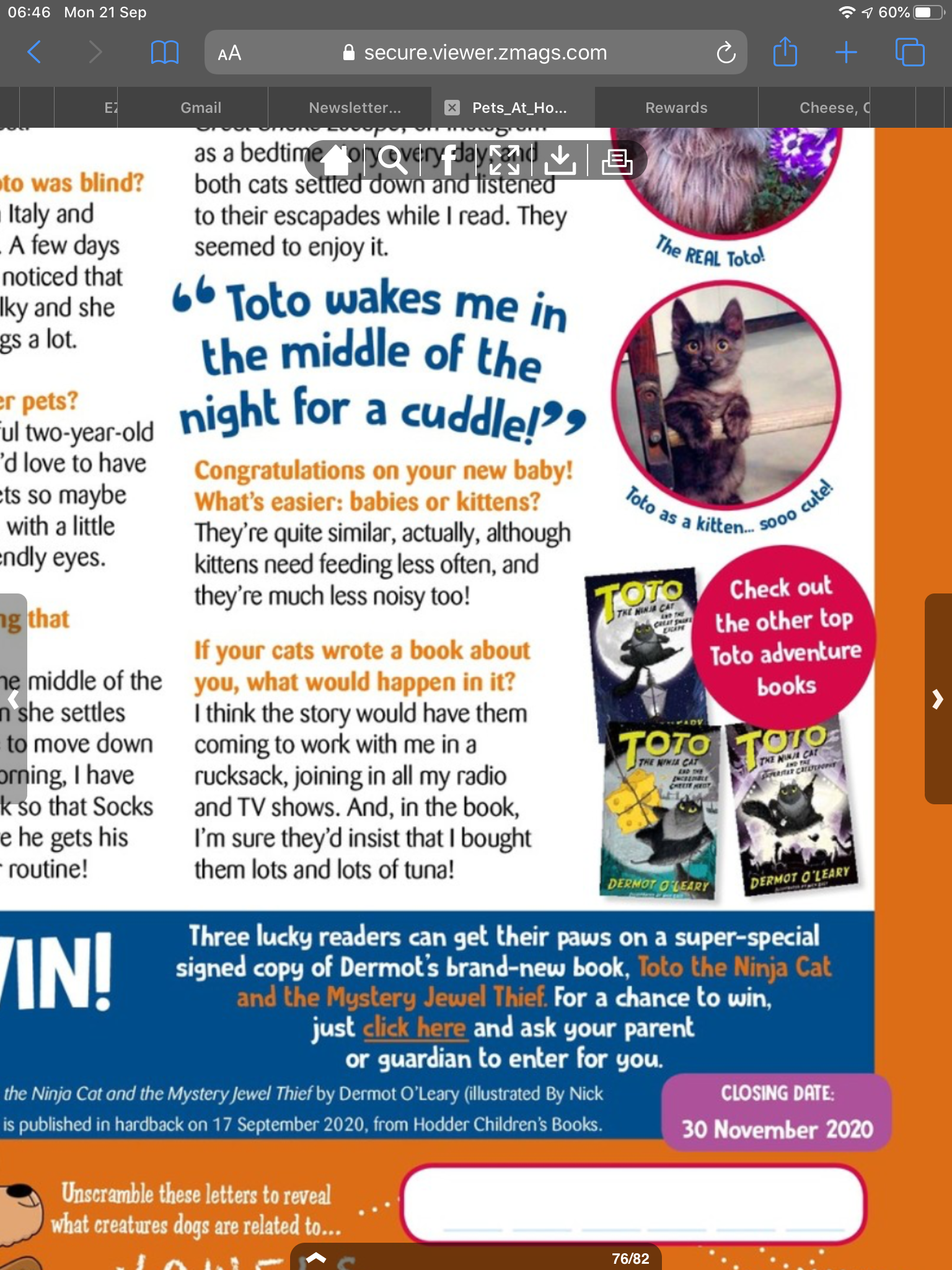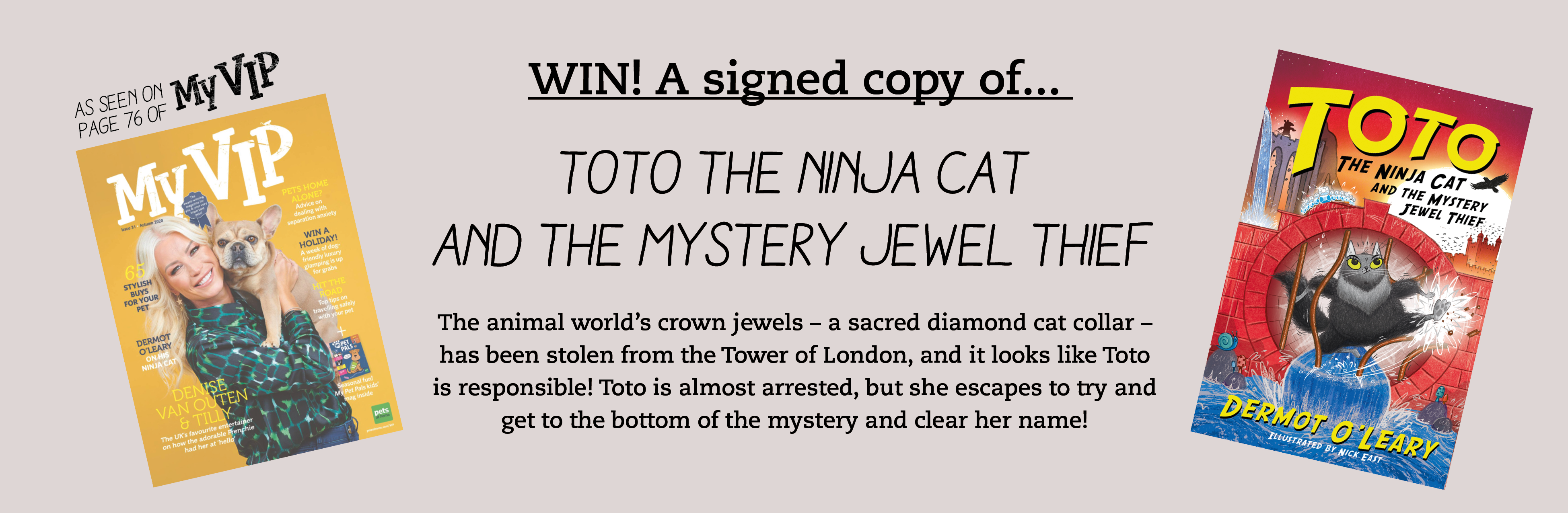 Win one of three copies of Dermot O'Leary's book, 'Toto the Ninja Cat and the Mystery Jewel Thief'. As seen on page 76 of My VIP autumn edition.